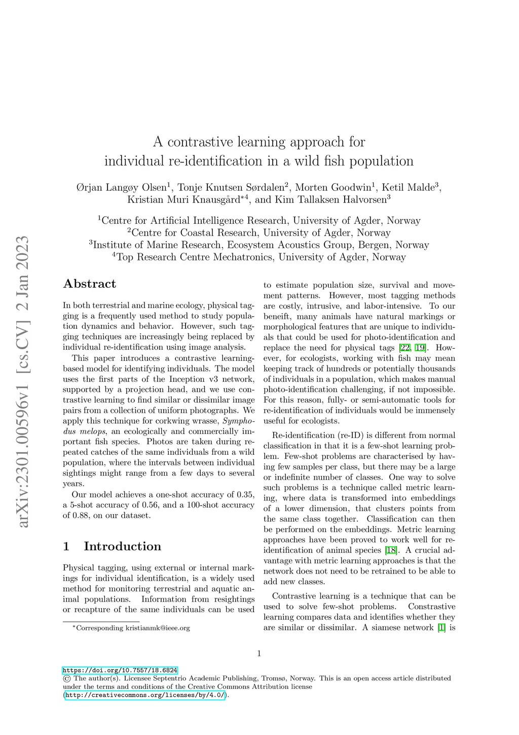 In both terrestrial and marine ecology, physical tagging is a frequently used method to study population dynamics and behavior. However, such tagging techniques are increasingly being replaced by individual re-identification using image analysis. This paper introduces a contrastive learning-based model for identifying individuals. The model uses the first parts of the Inception v3 network, supported by a projection head, and we use contrastive learning to find similar or dissimilar image pairs from a collection of uniform photographs. We apply this technique for corkwing wrasse, Symphodus melops, an ecologically and commercially important fish species. Photos are taken during repeated catches of the same individuals from a wild population, where the intervals between individual sightings might range from a few days to several years. Our model achieves a one-shot accuracy of 0.35, a 5-shot accuracy of 0.56, and a 100-shot accuracy of 0.88, on our dataset.