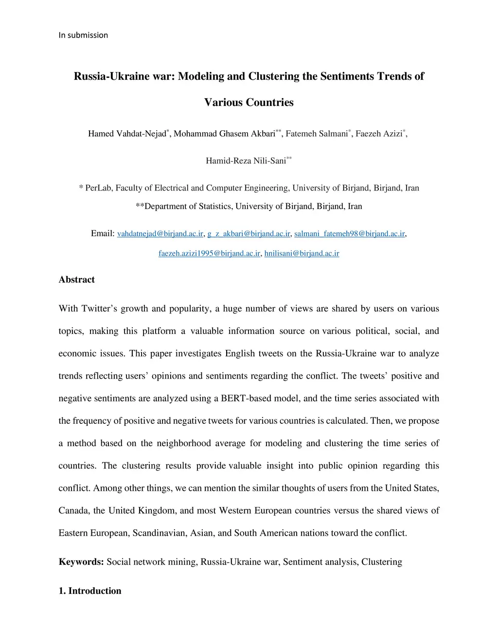 With Twitter's growth and popularity, a huge number of views are shared by users on various topics, making this platform a valuable information source on various political, social, and economic issues. This paper investigates English tweets on the Russia-Ukraine war to analyze trends reflecting users' opinions and sentiments regarding the conflict. The tweets' positive and negative sentiments are analyzed using a BERT-based model, and the time series associated with the frequency of positive and negative tweets for various countries is calculated. Then, we propose a method based on the neighborhood average for modeling and clustering the time series of countries. The clustering results provide valuable insight into public opinion regarding this conflict. Among other things, we can mention the similar thoughts of users from the United States, Canada, the United Kingdom, and most Western European countries versus the shared views of Eastern European, Scandinavian, Asian, and South American nations toward the conflict.