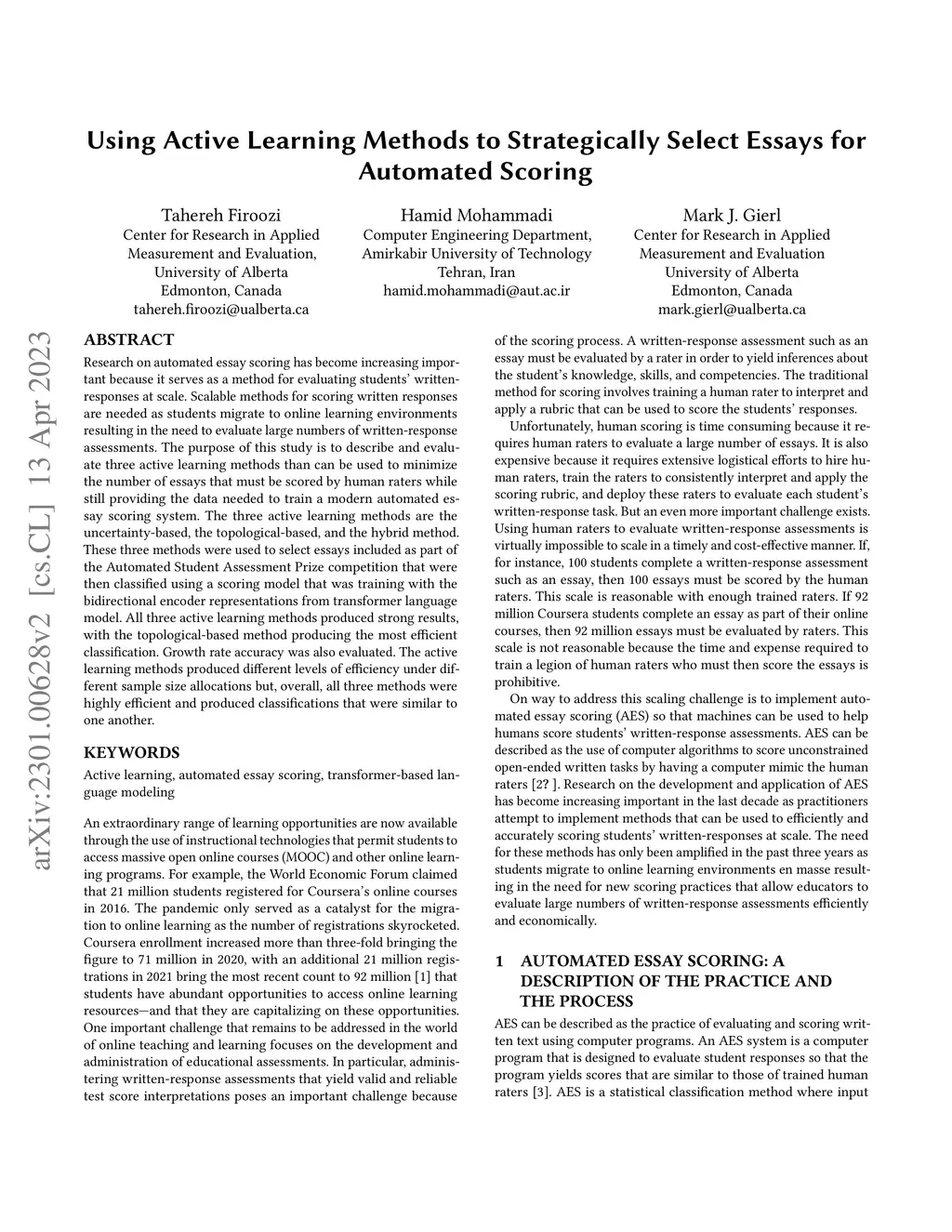 Research on automated essay scoring has become increasing important because it serves as a method for evaluating students' written-responses at scale. Scalable methods for scoring written responses are needed as students migrate to online learning environments resulting in the need to evaluate large numbers of written-response assessments. The purpose of this study is to describe and evaluate three active learning methods than can be used to minimize the number of essays that must be scored by human raters while still providing the data needed to train a modern automated essay scoring system. The three active learning methods are the uncertainty-based, the topological-based, and the hybrid method. These three methods were used to select essays included as part of the Automated Student Assessment Prize competition that were then classified using a scoring model that was training with the bidirectional encoder representations from transformer language model. All three active learning methods produced strong results, with the topological-based method producing the most efficient classification. Growth rate accuracy was also evaluated. The active learning methods produced different levels of efficiency under different sample size allocations but, overall, all three methods were highly efficient and produced classifications that were similar to one another.