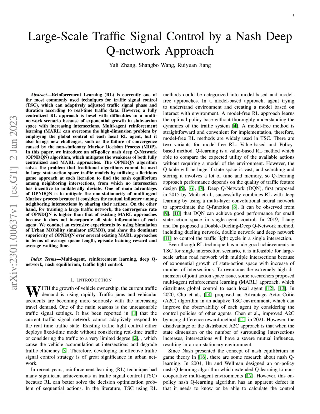 Reinforcement Learning (RL) is currently one of the most commonly used techniques for traffic signal control (TSC), which can adaptively adjusted traffic signal phase and duration according to real-time traffic data. However, a fully centralized RL approach is beset with difficulties in a multi-network scenario because of exponential growth in state-action space with increasing intersections. Multi-agent reinforcement learning (MARL) can overcome the high-dimension problem by employing the global control of each local RL agent, but it also brings new challenges, such as the failure of convergence caused by the non-stationary Markov Decision Process (MDP). In this paper, we introduce an off-policy nash deep Q-Network (OPNDQN) algorithm, which mitigates the weakness of both fully centralized and MARL approaches. The OPNDQN algorithm solves the problem that traditional algorithms cannot be used in large state-action space traffic models by utilizing a fictitious game approach at each iteration to find the nash equilibrium among neighboring intersections, from which no intersection has incentive to unilaterally deviate. One of main advantages of OPNDQN is to mitigate the non-stationarity of multi-agent Markov process because it considers the mutual influence among neighboring intersections by sharing their actions. On the other hand, for training a large traffic network, the convergence rate of OPNDQN is higher than that of existing MARL approaches because it does not incorporate all state information of each agent. We conduct an extensive experiments by using Simulation of Urban MObility simulator (SUMO), and show the dominant superiority of OPNDQN over several existing MARL approaches in terms of average queue length, episode training reward and average waiting time.