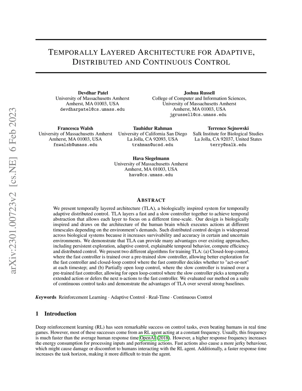 We present temporally layered architecture (TLA), a biologically inspired system for temporally adaptive distributed control. TLA layers a fast and a slow controller together to achieve temporal abstraction that allows each layer to focus on a different time-scale. Our design is biologically inspired and draws on the architecture of the human brain which executes actions at different timescales depending on the environment's demands. Such distributed control design is widespread across biological systems because it increases survivability and accuracy in certain and uncertain environments. We demonstrate that TLA can provide many advantages over existing approaches, including persistent exploration, adaptive control, explainable temporal behavior, compute efficiency and distributed control. We present two different algorithms for training TLA: (a) Closed-loop control, where the fast controller is trained over a pre-trained slow controller, allowing better exploration for the fast controller and closed-loop control where the fast controller decides whether to "act-or-not" at each timestep; and (b) Partially open loop control, where the slow controller is trained over a pre-trained fast controller, allowing for open loop-control where the slow controller picks a temporally extended action or defers the next n-actions to the fast controller. We evaluated our method on a suite of continuous control tasks and demonstrate the advantages of TLA over several strong baselines.