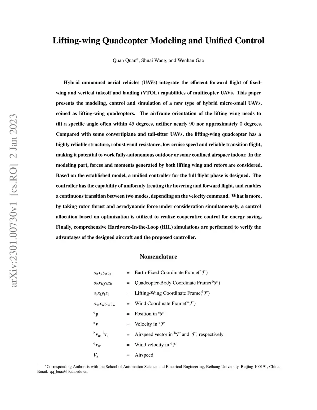 Hybrid unmanned aerial vehicles (UAVs) integrate the efficient forward flight of fixed-wing and vertical takeoff and landing (VTOL) capabilities of multicopter UAVs. This paper presents the modeling, control and simulation of a new type of hybrid micro-small UAVs, coined as lifting-wing quadcopters. The airframe orientation of the lifting wing needs to tilt a specific angle often within $ 45$ degrees, neither nearly $ 90$ nor approximately $ 0$ degrees. Compared with some convertiplane and tail-sitter UAVs, the lifting-wing quadcopter has a highly reliable structure, robust wind resistance, low cruise speed and reliable transition flight, making it potential to work fully-autonomous outdoor or some confined airspace indoor. In the modeling part, forces and moments generated by both lifting wing and rotors are considered. Based on the established model, a unified controller for the full flight phase is designed. The controller has the capability of uniformly treating the hovering and forward flight, and enables a continuous transition between two modes, depending on the velocity command. What is more, by taking rotor thrust and aerodynamic force under consideration simultaneously, a control allocation based on optimization is utilized to realize cooperative control for energy saving. Finally, comprehensive Hardware-In-the-Loop (HIL) simulations are performed to verify the advantages of the designed aircraft and the proposed controller.
