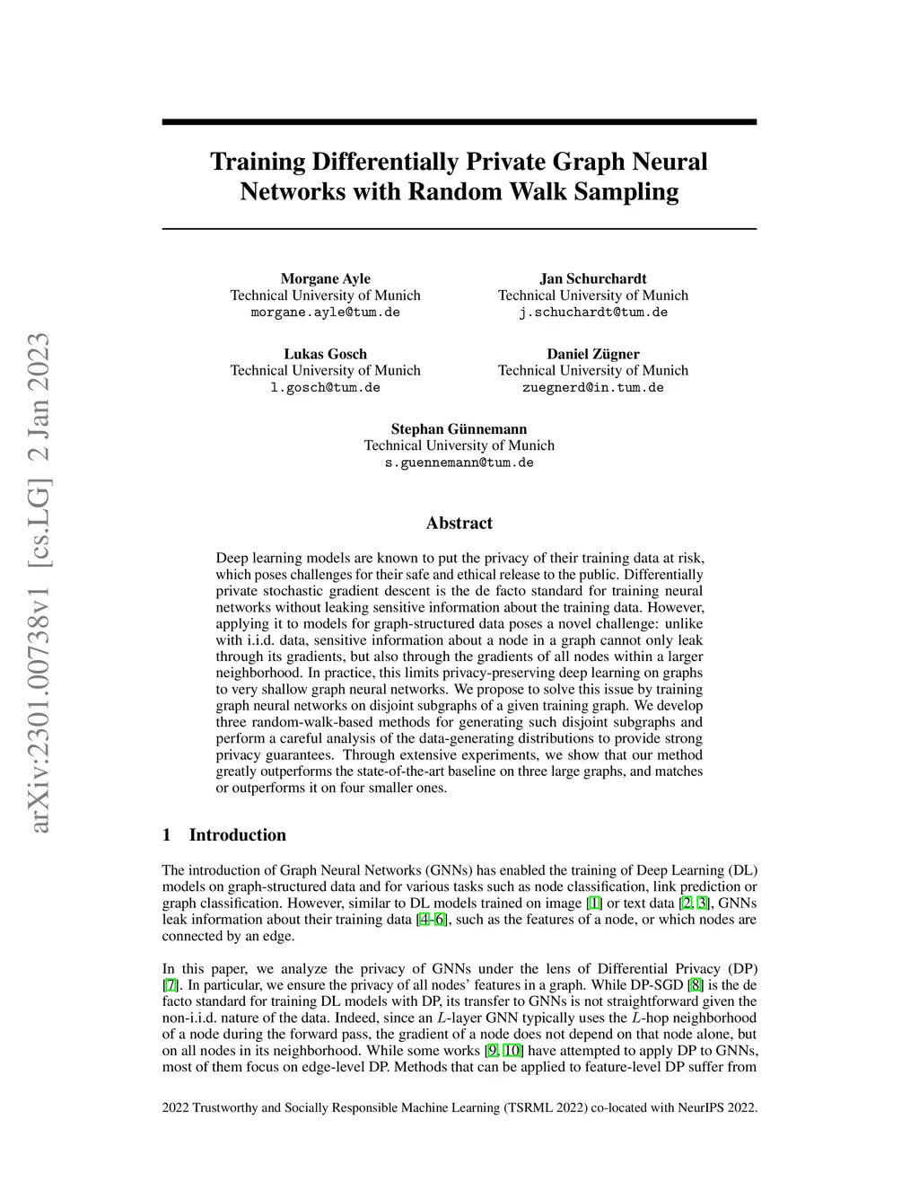 Deep learning models are known to put the privacy of their training data at risk, which poses challenges for their safe and ethical release to the public. Differentially private stochastic gradient descent is the de facto standard for training neural networks without leaking sensitive information about the training data. However, applying it to models for graph-structured data poses a novel challenge: unlike with i.i.d. data, sensitive information about a node in a graph cannot only leak through its gradients, but also through the gradients of all nodes within a larger neighborhood. In practice, this limits privacy-preserving deep learning on graphs to very shallow graph neural networks. We propose to solve this issue by training graph neural networks on disjoint subgraphs of a given training graph. We develop three random-walk-based methods for generating such disjoint subgraphs and perform a careful analysis of the data-generating distributions to provide strong privacy guarantees. Through extensive experiments, we show that our method greatly outperforms the state-of-the-art baseline on three large graphs, and matches or outperforms it on four smaller ones.