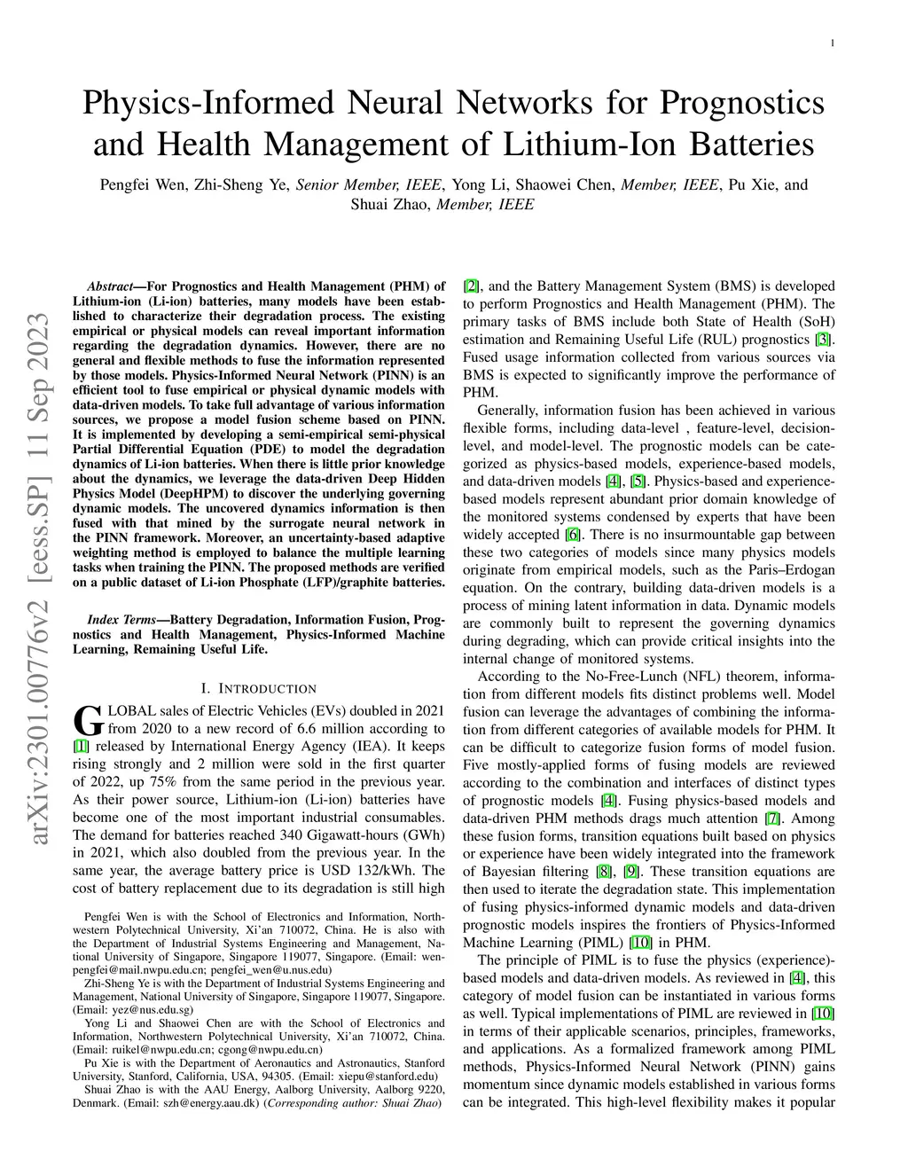 For Prognostics and Health Management (PHM) of Lithium-ion (Li-ion) batteries, many models have been established to characterize their degradation process. The existing empirical or physical models can reveal important information regarding the degradation dynamics. However, there are no general and flexible methods to fuse the information represented by those models. Physics-Informed Neural Network (PINN) is an efficient tool to fuse empirical or physical dynamic models with data-driven models. To take full advantage of various information sources, we propose a model fusion scheme based on PINN. It is implemented by developing a semi-empirical semi-physical Partial Differential Equation (PDE) to model the degradation dynamics of Li-ion batteries. When there is little prior knowledge about the dynamics, we leverage the data-driven Deep Hidden Physics Model (DeepHPM) to discover the underlying governing dynamic models. The uncovered dynamics information is then fused with that mined by the surrogate neural network in the PINN framework. Moreover, an uncertainty-based adaptive weighting method is employed to balance the multiple learning tasks when training the PINN. The proposed methods are verified on a public dataset of Li-ion Phosphate (LFP)/graphite batteries.