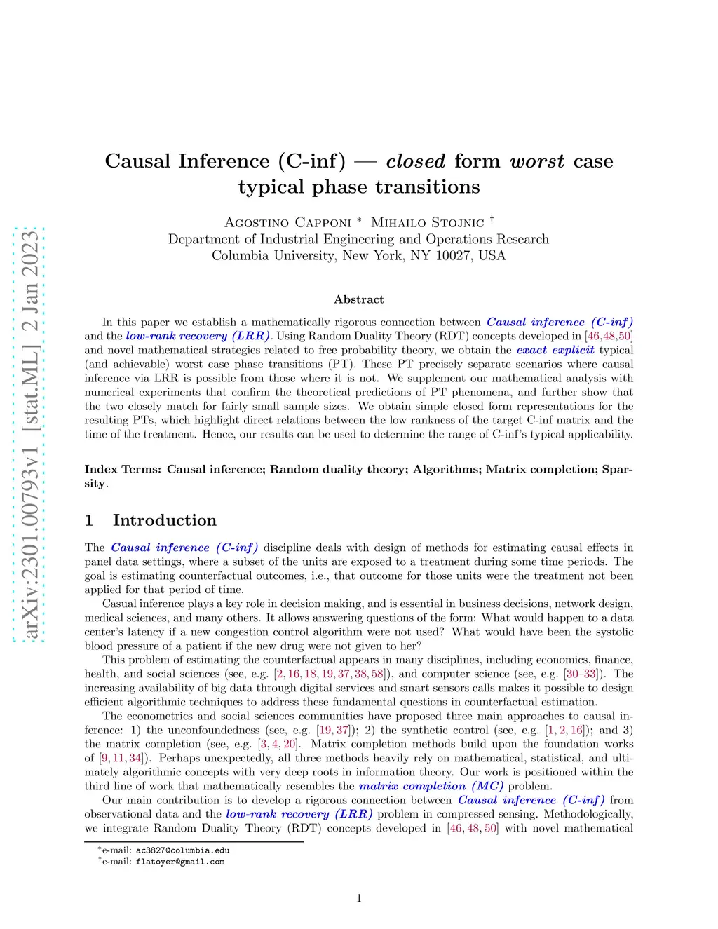 In this paper we establish a mathematically rigorous connection between Causal inference (C-inf) and the low-rank recovery (LRR). Using Random Duality Theory (RDT) concepts developed in [46,48,50] and novel mathematical strategies related to free probability theory, we obtain the exact explicit typical (and achievable) worst case phase transitions (PT). These PT precisely separate scenarios where causal inference via LRR is possible from those where it is not. We supplement our mathematical analysis with numerical experiments that confirm the theoretical predictions of PT phenomena, and further show that the two closely match for fairly small sample sizes. We obtain simple closed form representations for the resulting PTs, which highlight direct relations between the low rankness of the target C-inf matrix and the time of the treatment. Hence, our results can be used to determine the range of C-inf's typical applicability.