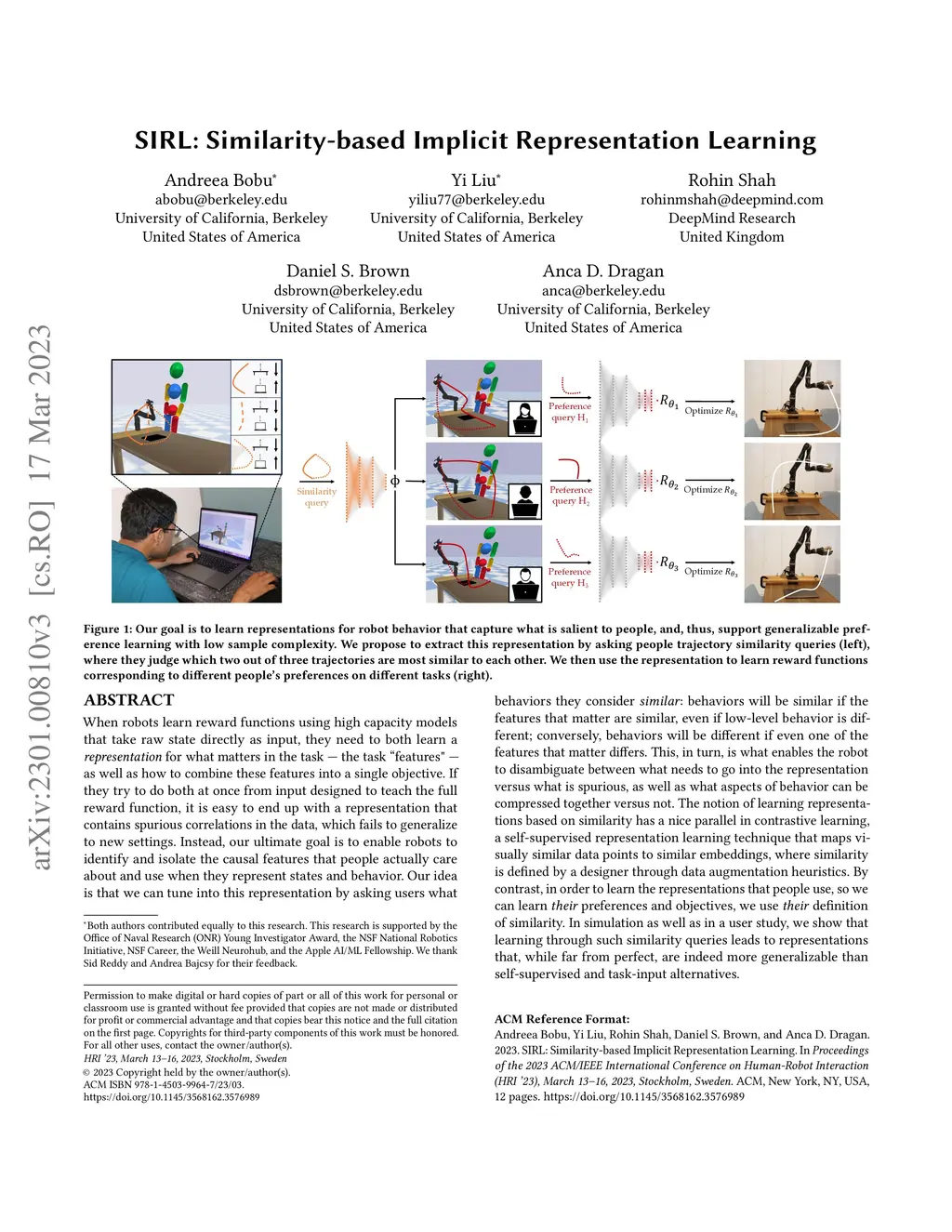 When robots learn reward functions using high capacity models that take raw state directly as input, they need to both learn a representation for what matters in the task -- the task ``features" -- as well as how to combine these features into a single objective. If they try to do both at once from input designed to teach the full reward function, it is easy to end up with a representation that contains spurious correlations in the data, which fails to generalize to new settings. Instead, our ultimate goal is to enable robots to identify and isolate the causal features that people actually care about and use when they represent states and behavior. Our idea is that we can tune into this representation by asking users what behaviors they consider similar: behaviors will be similar if the features that matter are similar, even if low-level behavior is different; conversely, behaviors will be different if even one of the features that matter differs. This, in turn, is what enables the robot to disambiguate between what needs to go into the representation versus what is spurious, as well as what aspects of behavior can be compressed together versus not. The notion of learning representations based on similarity has a nice parallel in contrastive learning, a self-supervised representation learning technique that maps visually similar data points to similar embeddings, where similarity is defined by a designer through data augmentation heuristics. By contrast, in order to learn the representations that people use, so we can learn their preferences and objectives, we use their definition of similarity. In simulation as well as in a user study, we show that learning through such similarity queries leads to representations that, while far from perfect, are indeed more generalizable than self-supervised and task-input alternatives.