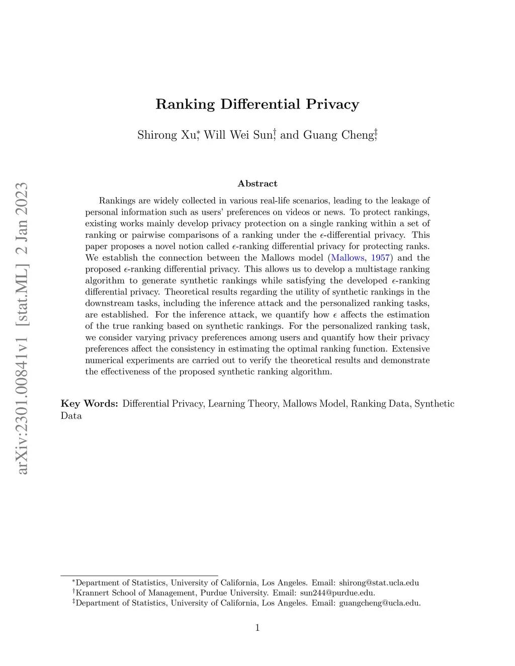 Rankings are widely collected in various real-life scenarios, leading to the leakage of personal information such as users' preferences on videos or news. To protect rankings, existing works mainly develop privacy protection on a single ranking within a set of ranking or pairwise comparisons of a ranking under the -differential privacy. This paper proposes a novel notion called -ranking differential privacy for protecting ranks. We establish the connection between the Mallows model (Mallows, 1957) and the proposed -ranking differential privacy. This allows us to develop a multistage ranking algorithm to generate synthetic rankings while satisfying the developed -ranking differential privacy. Theoretical results regarding the utility of synthetic rankings in the downstream tasks, including the inference attack and the personalized ranking tasks, are established. For the inference attack, we quantify how affects the estimation of the true ranking based on synthetic rankings. For the personalized ranking task, we consider varying privacy preferences among users and quantify how their privacy preferences affect the consistency in estimating the optimal ranking function. Extensive numerical experiments are carried out to verify the theoretical results and demonstrate the effectiveness of the proposed synthetic ranking algorithm.