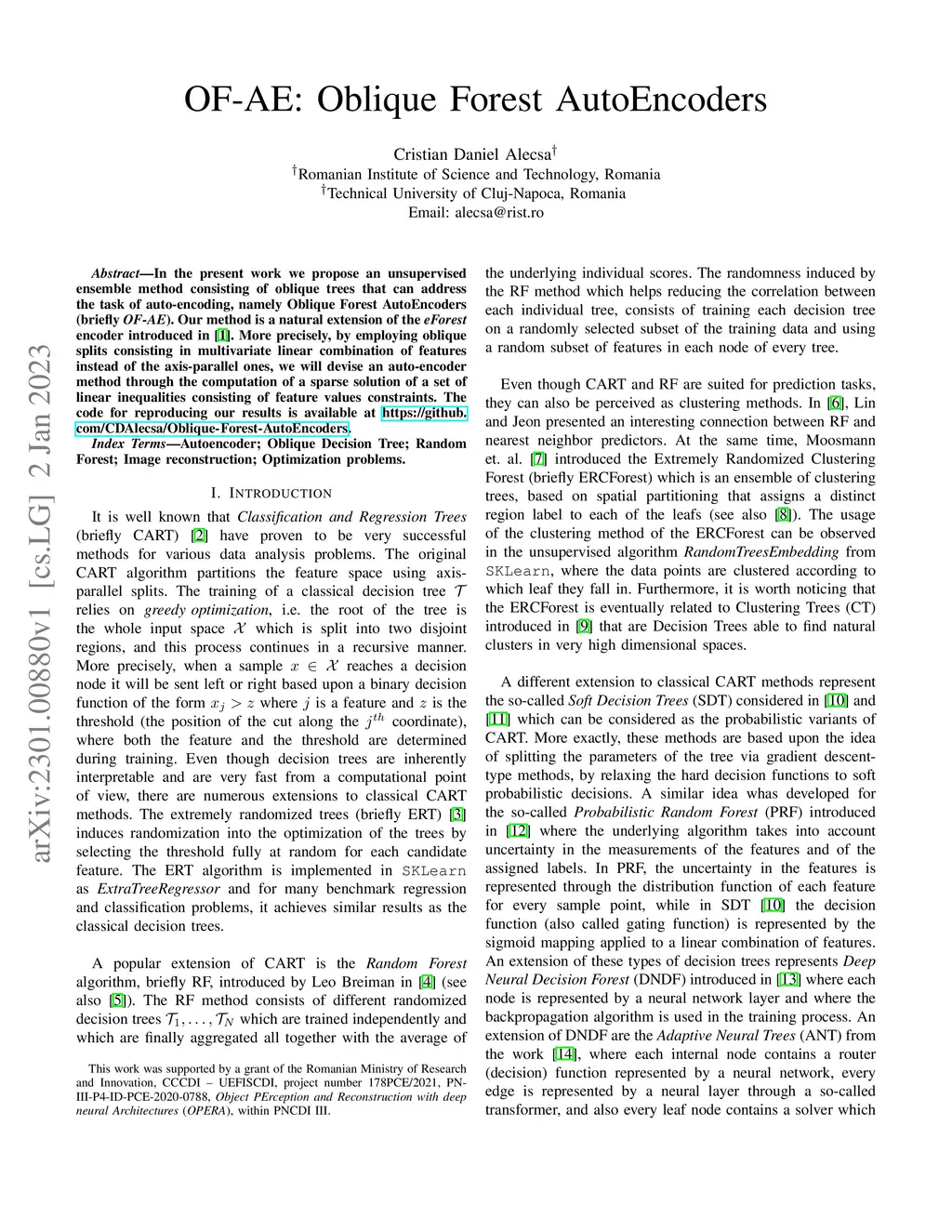 In the present work we propose an unsupervised ensemble method consisting of oblique trees that can address the task of auto-encoding, namely Oblique Forest AutoEncoders (briefly OF-AE). Our method is a natural extension of the eForest encoder introduced in [1]. More precisely, by employing oblique splits consisting in multivariate linear combination of features instead of the axis-parallel ones, we will devise an auto-encoder method through the computation of a sparse solution of a set of linear inequalities consisting of feature values constraints. The code for reproducing our results is available at https://github.com/CDAlecsa/Oblique-Forest-AutoEncoders.