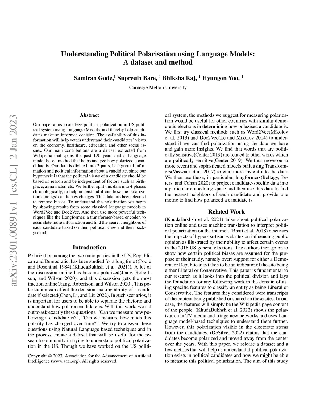 Our paper aims to analyze political polarization in US political system using Language Models, and thereby help candidates make an informed decision. The availability of this information will help voters understand their candidates views on the economy, healthcare, education and other social issues. Our main contributions are a dataset extracted from Wikipedia that spans the past 120 years and a Language model based method that helps analyze how polarized a candidate is. Our data is divided into 2 parts, background information and political information about a candidate, since our hypothesis is that the political views of a candidate should be based on reason and be independent of factors such as birthplace, alma mater, etc. We further split this data into 4 phases chronologically, to help understand if and how the polarization amongst candidates changes. This data has been cleaned to remove biases. To understand the polarization we begin by showing results from some classical language models in Word2Vec and Doc2Vec. And then use more powerful techniques like the Longformer, a transformer based encoder, to assimilate more information and find the nearest neighbors of each candidate based on their political view and their background.