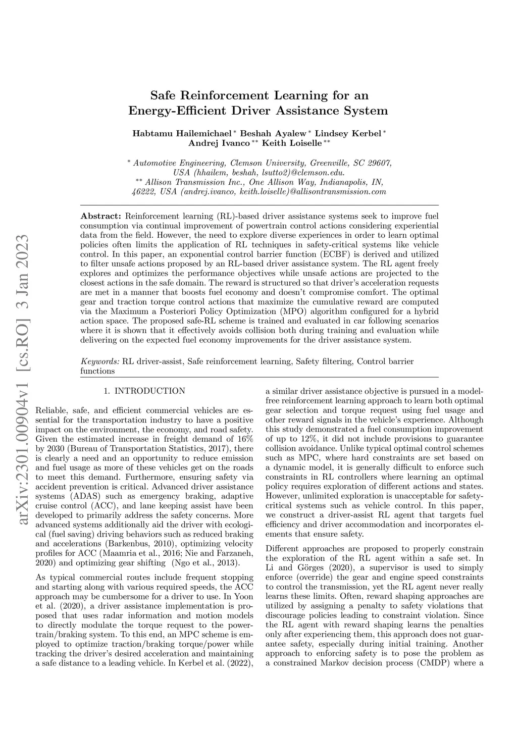Reinforcement learning (RL)-based driver assistance systems seek to improve fuel consumption via continual improvement of powertrain control actions considering experiential data from the field. However, the need to explore diverse experiences in order to learn optimal policies often limits the application of RL techniques in safety-critical systems like vehicle control. In this paper, an exponential control barrier function (ECBF) is derived and utilized to filter unsafe actions proposed by an RL-based driver assistance system. The RL agent freely explores and optimizes the performance objectives while unsafe actions are projected to the closest actions in the safe domain. The reward is structured so that driver's acceleration requests are met in a manner that boosts fuel economy and doesn't compromise comfort. The optimal gear and traction torque control actions that maximize the cumulative reward are computed via the Maximum a Posteriori Policy Optimization (MPO) algorithm configured for a hybrid action space. The proposed safe-RL scheme is trained and evaluated in car following scenarios where it is shown that it effectively avoids collision both during training and evaluation while delivering on the expected fuel economy improvements for the driver assistance system.