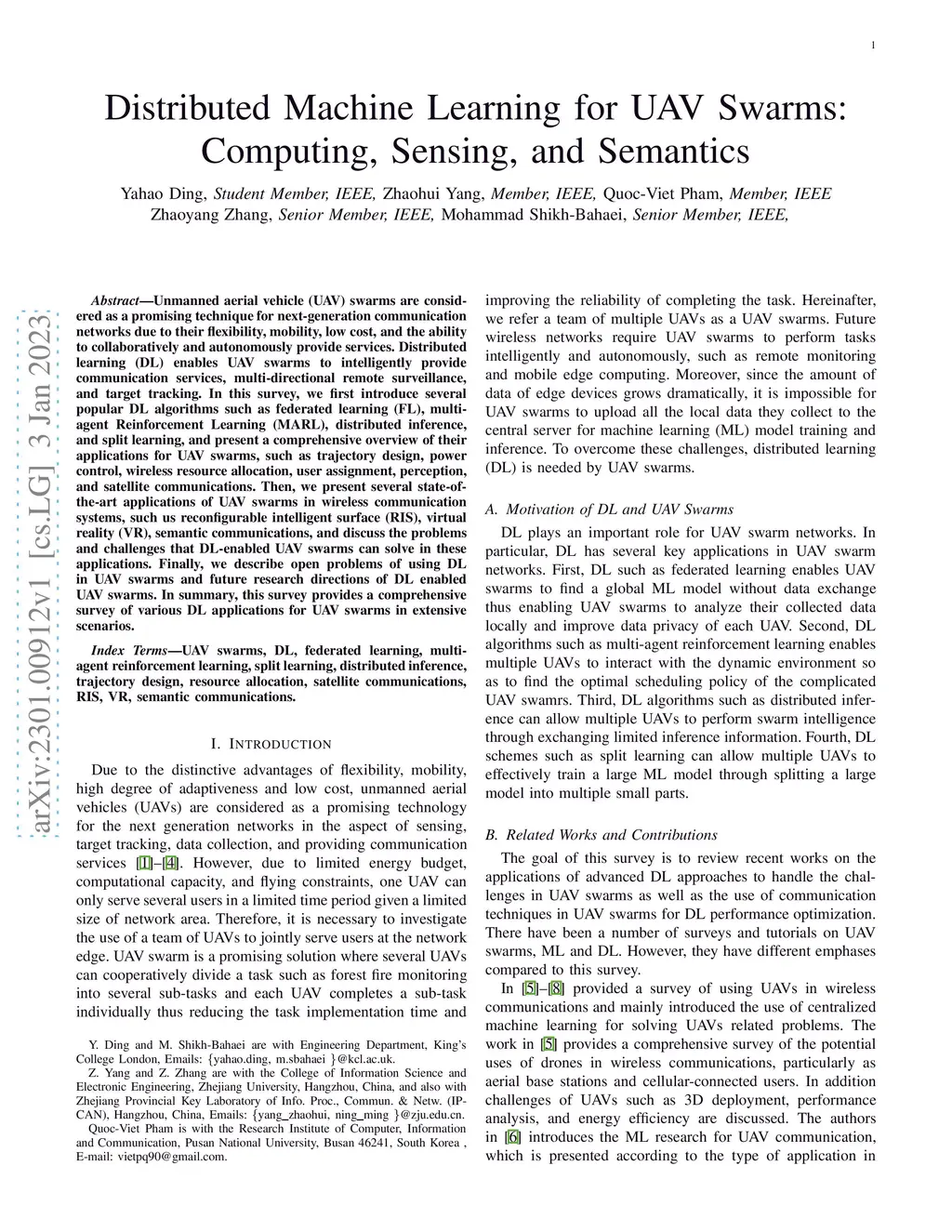 Distributed Machine Learning for UAV Swarms: Computing, Sensing, and