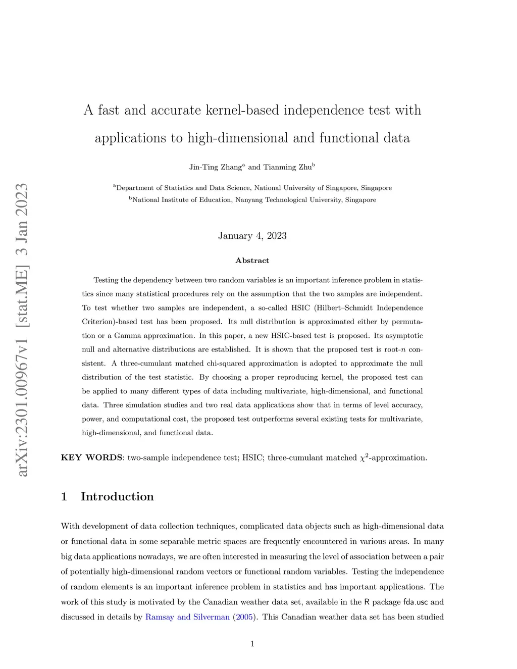 Testing the dependency between two random variables is an important inference problem in statistics since many statistical procedures rely on the assumption that the two samples are independent. To test whether two samples are independent, a so-called HSIC (Hilbert--Schmidt Independence Criterion)-based test has been proposed. Its null distribution is approximated either by permutation or a Gamma approximation. In this paper, a new HSIC-based test is proposed. Its asymptotic null and alternative distributions are established. It is shown that the proposed test is root-n consistent. A three-cumulant matched chi-squared approximation is adopted to approximate the null distribution of the test statistic. By choosing a proper reproducing kernel, the proposed test can be applied to many different types of data including multivariate, high-dimensional, and functional data. Three simulation studies and two real data applications show that in terms of level accuracy, power, and computational cost, the proposed test outperforms several existing tests for multivariate, high-dimensional, and functional data.