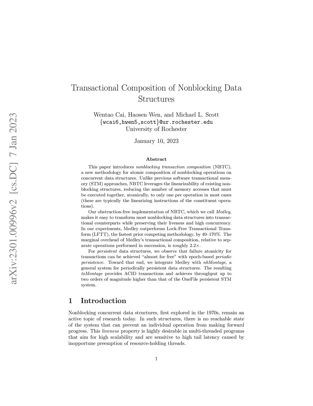 This paper introduces nonblocking transaction composition (NBTC), a new methodology for atomic composition of nonblocking operations on concurrent data structures. Unlike previous software transactional memory (STM) approaches, NBTC leverages the linearizability of existing nonblocking structures, reducing the number of memory accesses that must be executed together, atomically, to only one per operation in most cases (these are typically the linearizing instructions of the constituent operations). Our obstruction-free implementation of NBTC, which we call Medley, makes it easy to transform most nonblocking data structures into transactional counterparts while preserving their nonblocking liveness and high concurrency. In our experiments, Medley outperforms Lock-Free Transactional Transform (LFTT), the fastest prior competing methodology, by 40--170%. The marginal overhead of Medley's transactional composition, relative to separate operations performed in succession, is roughly 2.2. For persistent data structures, we observe that failure atomicity for transactions can be achieved "almost for free" with epoch-based periodic persistence. Toward that end, we integrate Medley with nbMontage, a general system for periodically persistent data structures. The resulting txMontage provides ACID transactions and achieves throughput up to two orders of magnitude higher than that of the OneFile persistent STM system.