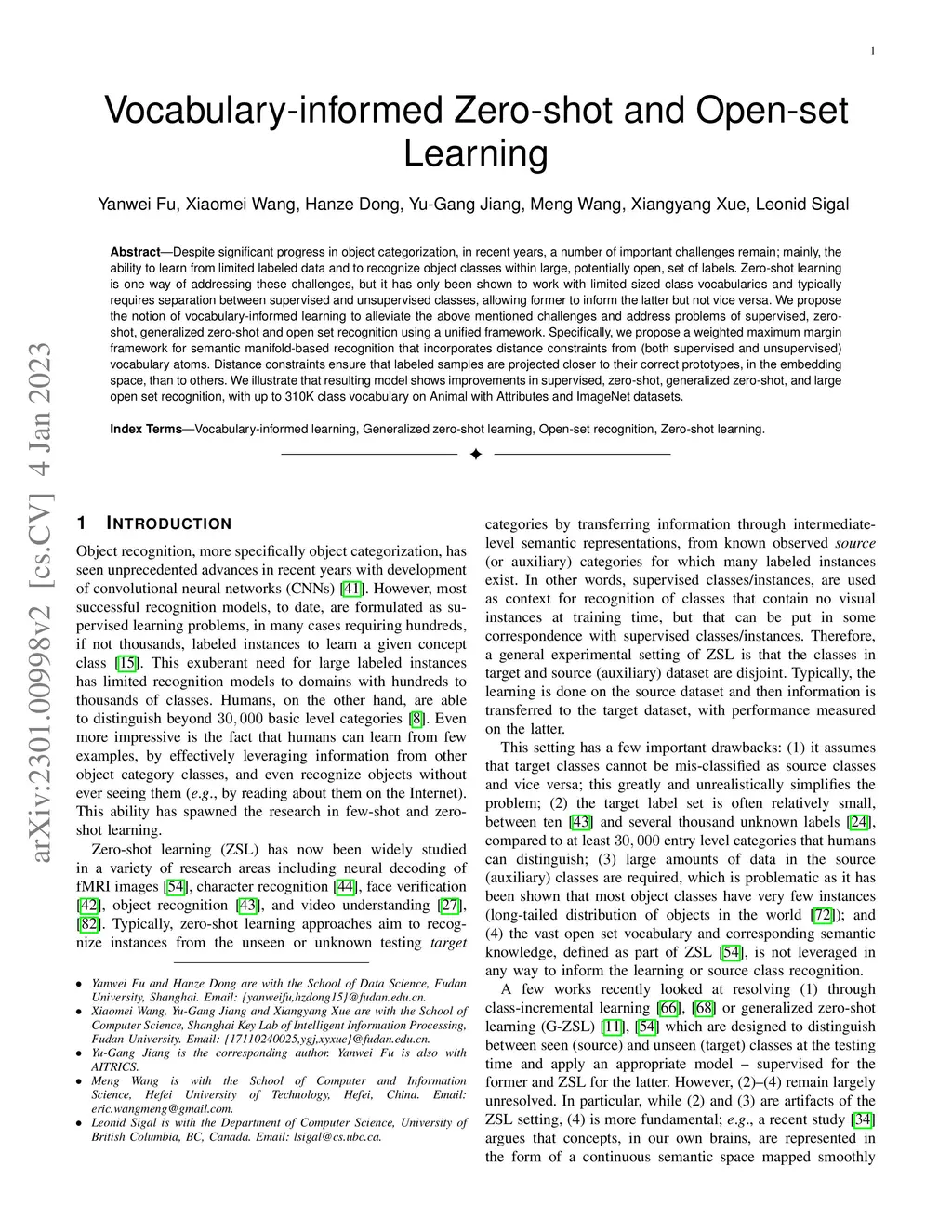 Despite significant progress in object categorization, in recent years, a number of important challenges remain; mainly, the ability to learn from limited labeled data and to recognize object classes within large, potentially open, set of labels. Zero-shot learning is one way of addressing these challenges, but it has only been shown to work with limited sized class vocabularies and typically requires separation between supervised and unsupervised classes, allowing former to inform the latter but not vice versa. We propose the notion of vocabulary-informed learning to alleviate the above mentioned challenges and address problems of supervised, zero-shot, generalized zero-shot and open set recognition using a unified framework. Specifically, we propose a weighted maximum margin framework for semantic manifold-based recognition that incorporates distance constraints from (both supervised and unsupervised) vocabulary atoms. Distance constraints ensure that labeled samples are projected closer to their correct prototypes, in the embedding space, than to others. We illustrate that resulting model shows improvements in supervised, zero-shot, generalized zero-shot, and large open set recognition, with up to 310K class vocabulary on Animal with Attributes and ImageNet datasets.