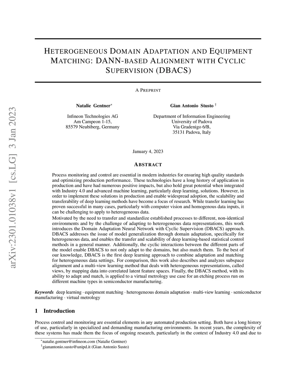 Process monitoring and control are essential in modern industries for ensuring high quality standards and optimizing production performance. These technologies have a long history of application in production and have had numerous positive impacts, but also hold great potential when integrated with Industry 4.0 and advanced machine learning, particularly deep learning, solutions. However, in order to implement these solutions in production and enable widespread adoption, the scalability and transferability of deep learning methods have become a focus of research. While transfer learning has proven successful in many cases, particularly with computer vision and homogenous data inputs, it can be challenging to apply to heterogeneous data. Motivated by the need to transfer and standardize established processes to different, non-identical environments and by the challenge of adapting to heterogeneous data representations, this work introduces the Domain Adaptation Neural Network with Cyclic Supervision (DBACS) approach. DBACS addresses the issue of model generalization through domain adaptation, specifically for heterogeneous data, and enables the transfer and scalability of deep learning-based statistical control methods in a general manner. Additionally, the cyclic interactions between the different parts of the model enable DBACS to not only adapt to the domains, but also match them. To the best of our knowledge, DBACS is the first deep learning approach to combine adaptation and matching for heterogeneous data settings. For comparison, this work also includes subspace alignment and a multi-view learning that deals with heterogeneous representations by mapping data into correlated latent feature spaces. Finally, DBACS with its ability to adapt and match, is applied to a virtual metrology use case for an etching process run on different machine types in semiconductor manufacturing.