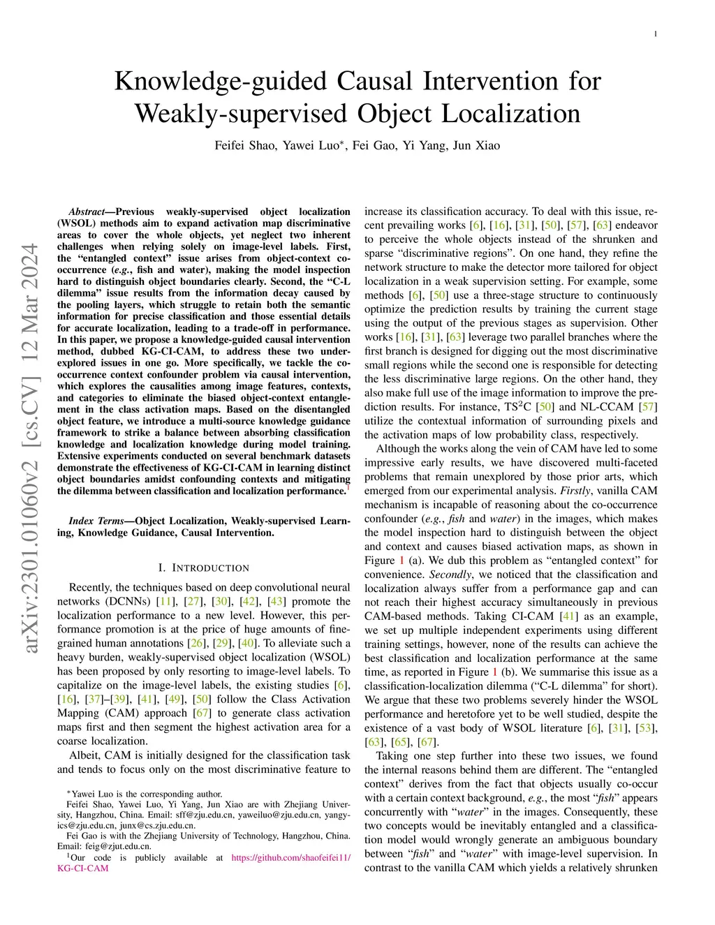 Previous weakly-supervised object localization (WSOL) methods aim to expand activation map discriminative areas to cover the whole objects, yet neglect two inherent challenges when relying solely on image-level labels. First, the ``entangled context'' issue arises from object-context co-occurrence (\eg, fish and water), making the model inspection hard to distinguish object boundaries clearly. Second, the ``C-L dilemma'' issue results from the information decay caused by the pooling layers, which struggle to retain both the semantic information for precise classification and those essential details for accurate localization, leading to a trade-off in performance. In this paper, we propose a knowledge-guided causal intervention method, dubbed KG-CI-CAM, to address these two under-explored issues in one go. More specifically, we tackle the co-occurrence context confounder problem via causal intervention, which explores the causalities among image features, contexts, and categories to eliminate the biased object-context entanglement in the class activation maps. Based on the disentangled object feature, we introduce a multi-source knowledge guidance framework to strike a balance between absorbing classification knowledge and localization knowledge during model training. Extensive experiments conducted on several benchmark datasets demonstrate the effectiveness of KG-CI-CAM in learning distinct object boundaries amidst confounding contexts and mitigating the dilemma between classification and localization performance.