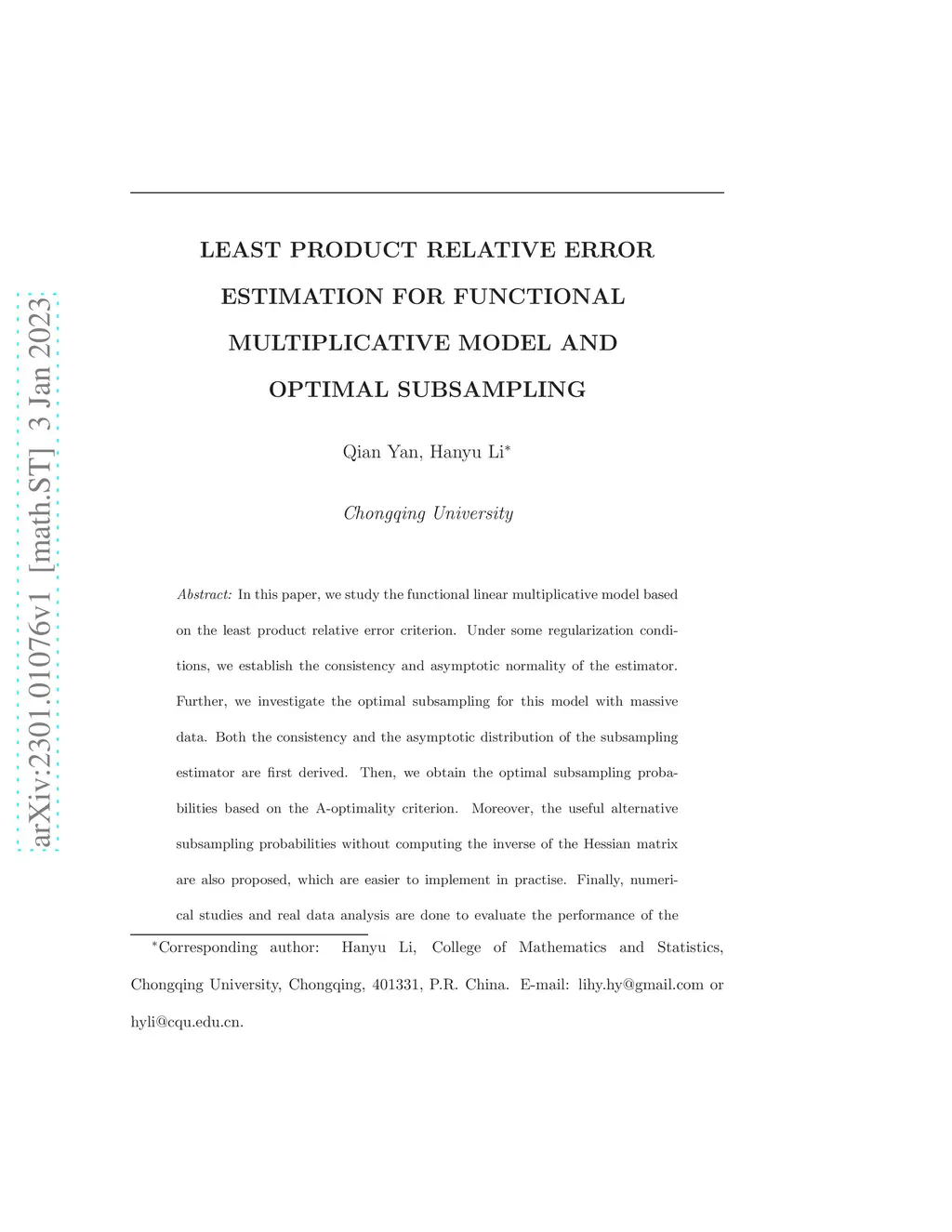 In this paper, we study the functional linear multiplicative model based on the least product relative error criterion. Under some regularization conditions, we establish the consistency and asymptotic normality of the estimator. Further, we investigate the optimal subsampling for this model with massive data. Both the consistency and the asymptotic distribution of the subsampling estimator are first derived. Then, we obtain the optimal subsampling probabilities based on the A-optimality criterion. Moreover, the useful alternative subsampling probabilities without computing the inverse of the Hessian matrix are also proposed, which are easier to implement in practise. Finally, numerical studies and real data analysis are done to evaluate the performance of the proposed approaches.