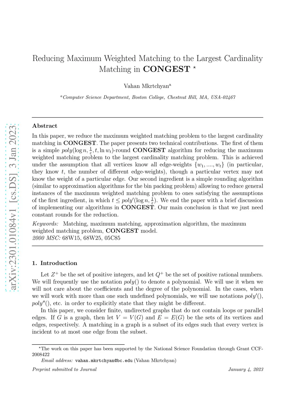 In this paper, we reduce the maximum weighted matching problem to the largest cardinality matching in {\bf CONGEST}. The paper presents two technical contributions. The first of them is a simple -round {\bf CONGEST} algorithm for reducing the maximum weighted matching problem to the largest cardinality matching problem. This is achieved under the assumption that all vertices know all edge-weights (in particular, they know , the number of different edge-weights), though a particular vertex may not know the weight of a particular edge. Our second ingredient is a simple rounding algorithm (similar to approximation algorithms for the bin packing problem) allowing to reduce general instances of the maximum weighted matching problem to ones satisfying the assumptions of the first ingredient, in which . We end the paper with a brief discussion of implementing our algorithms in {\bf CONGEST}. Our main conclusion is that we just need constant rounds for the reduction.