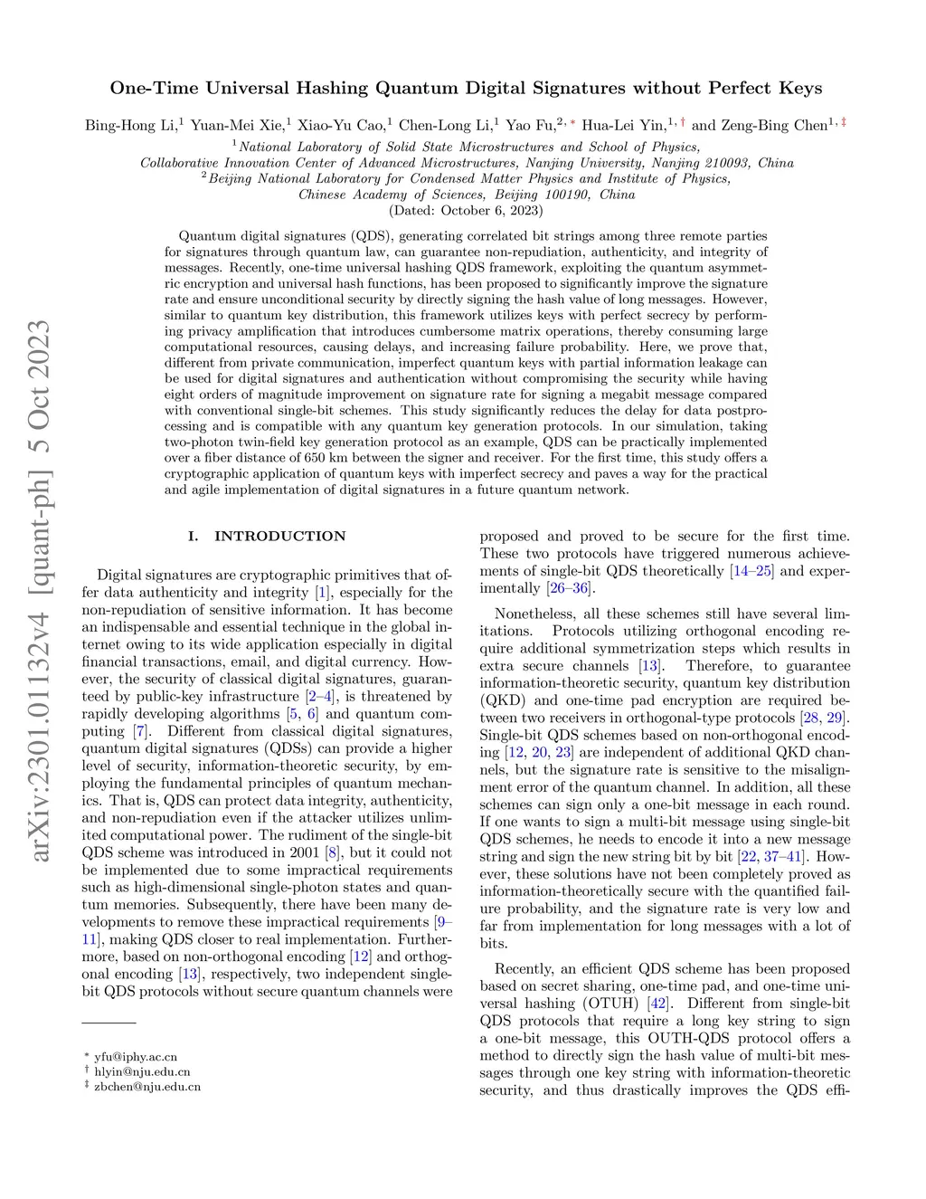 One-Time Universal Hashing Quantum Digital Signatures without Perfect