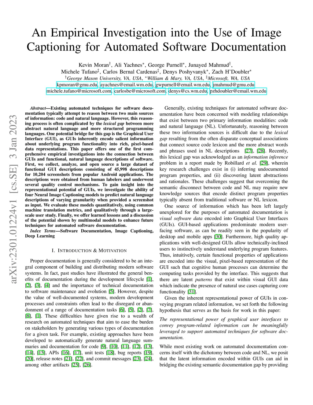 Existing automated techniques for software documentation typically attempt to reason between two main sources of information: code and natural language. However, this reasoning process is often complicated by the lexical gap between more abstract natural language and more structured programming languages. One potential bridge for this gap is the Graphical User Interface (GUI), as GUIs inherently encode salient information about underlying program functionality into rich, pixel-based data representations. This paper offers one of the first comprehensive empirical investigations into the connection between GUIs and functional, natural language descriptions of software. First, we collect, analyze, and open source a large dataset of functional GUI descriptions consisting of 45,998 descriptions for 10,204 screenshots from popular Android applications. The descriptions were obtained from human labelers and underwent several quality control mechanisms. To gain insight into the representational potential of GUIs, we investigate the ability of four Neural Image Captioning models to predict natural language descriptions of varying granularity when provided a screenshot as input. We evaluate these models quantitatively, using common machine translation metrics, and qualitatively through a large-scale user study. Finally, we offer learned lessons and a discussion of the potential shown by multimodal models to enhance future techniques for automated software documentation.