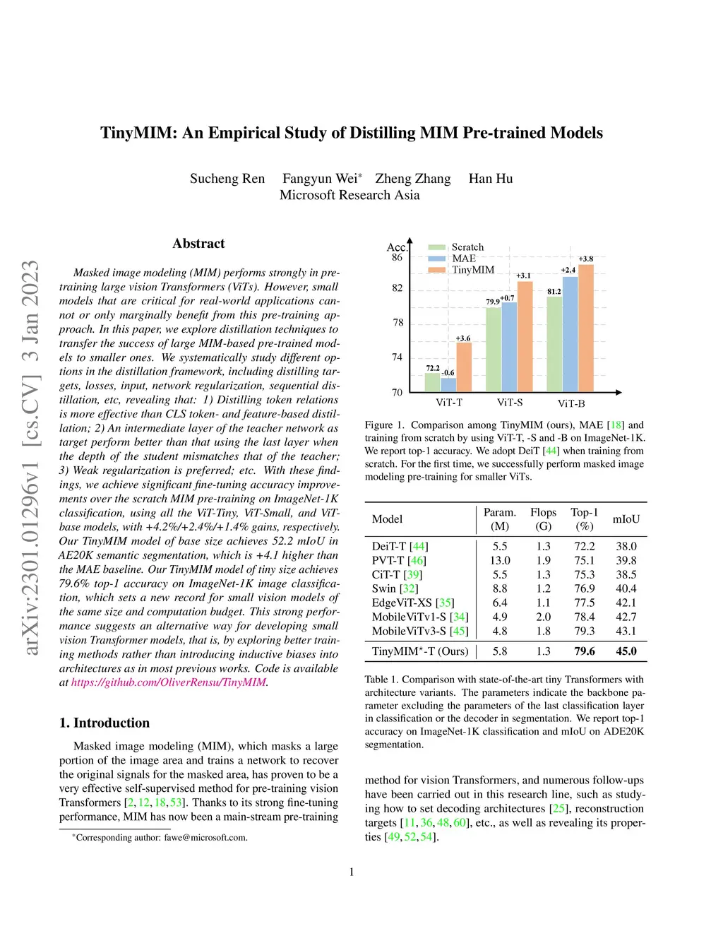 Masked image modeling (MIM) performs strongly in pre-training large vision Transformers (ViTs). However, small models that are critical for real-world applications cannot or only marginally benefit from this pre-training approach. In this paper, we explore distillation techniques to transfer the success of large MIM-based pre-trained models to smaller ones. We systematically study different options in the distillation framework, including distilling targets, losses, input, network regularization, sequential distillation, etc, revealing that: 1) Distilling token relations is more effective than CLS token- and feature-based distillation; 2) An intermediate layer of the teacher network as target perform better than that using the last layer when the depth of the student mismatches that of the teacher; 3) Weak regularization is preferred; etc. With these findings, we achieve significant fine-tuning accuracy improvements over the scratch MIM pre-training on ImageNet-1K classification, using all the ViT-Tiny, ViT-Small, and ViT-base models, with +4.2%/+2.4%/+1.4% gains, respectively. Our TinyMIM model of base size achieves 52.2 mIoU in AE20K semantic segmentation, which is +4.1 higher than the MAE baseline. Our TinyMIM model of tiny size achieves 79.6% top-1 accuracy on ImageNet-1K image classification, which sets a new record for small vision models of the same size and computation budget. This strong performance suggests an alternative way for developing small vision Transformer models, that is, by exploring better training methods rather than introducing inductive biases into architectures as in most previous works. Code is available at https://github.com/OliverRensu/TinyMIM.