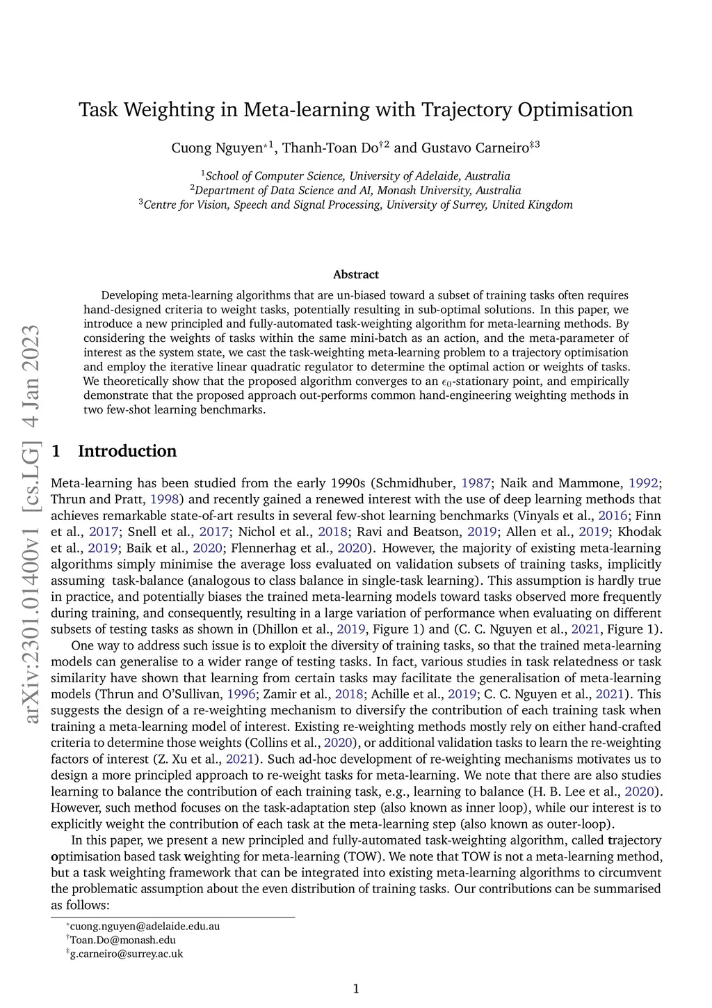 Developing meta-learning algorithms that are un-biased toward a subset of training tasks often requires hand-designed criteria to weight tasks, potentially resulting in sub-optimal solutions. In this paper, we introduce a new principled and fully-automated task-weighting algorithm for meta-learning methods. By considering the weights of tasks within the same mini-batch as an action, and the meta-parameter of interest as the system state, we cast the task-weighting meta-learning problem to a trajectory optimisation and employ the iterative linear quadratic regulator to determine the optimal action or weights of tasks. We theoretically show that the proposed algorithm converges to an -stationary point, and empirically demonstrate that the proposed approach out-performs common hand-engineering weighting methods in two few-shot learning benchmarks.