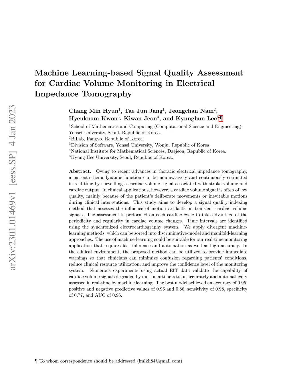 Owing to recent advances in thoracic electrical impedance tomography, a patient's hemodynamic function can be noninvasively and continuously estimated in real-time by surveilling a cardiac volume signal associated with stroke volume and cardiac output. In clinical applications, however, a cardiac volume signal is often of low quality, mainly because of the patient's deliberate movements or inevitable motions during clinical interventions. This study aims to develop a signal quality indexing method that assesses the influence of motion artifacts on transient cardiac volume signals. The assessment is performed on each cardiac cycle to take advantage of the periodicity and regularity in cardiac volume changes. Time intervals are identified using the synchronized electrocardiography system. We apply divergent machine-learning methods, which can be sorted into discriminative-model and manifold-learning approaches. The use of machine-learning could be suitable for our real-time monitoring application that requires fast inference and automation as well as high accuracy. In the clinical environment, the proposed method can be utilized to provide immediate warnings so that clinicians can minimize confusion regarding patients' conditions, reduce clinical resource utilization, and improve the confidence level of the monitoring system. Numerous experiments using actual EIT data validate the capability of cardiac volume signals degraded by motion artifacts to be accurately and automatically assessed in real-time by machine learning. The best model achieved an accuracy of 0.95, positive and negative predictive values of 0.96 and 0.86, sensitivity of 0.98, specificity of 0.77, and AUC of 0.96.
