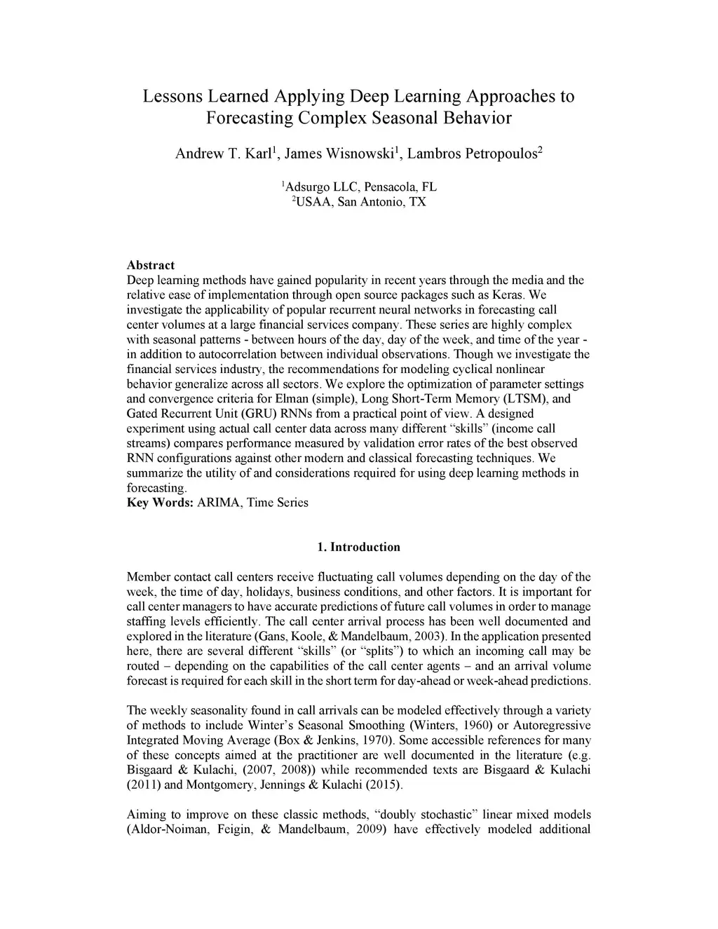 Deep learning methods have gained popularity in recent years through the media and the relative ease of implementation through open source packages such as Keras. We investigate the applicability of popular recurrent neural networks in forecasting call center volumes at a large financial services company. These series are highly complex with seasonal patterns - between hours of the day, day of the week, and time of the year - in addition to autocorrelation between individual observations. Though we investigate the financial services industry, the recommendations for modeling cyclical nonlinear behavior generalize across all sectors. We explore the optimization of parameter settings and convergence criteria for Elman (simple), Long Short-Term Memory (LTSM), and Gated Recurrent Unit (GRU) RNNs from a practical point of view. A designed experiment using actual call center data across many different "skills" (income call streams) compares performance measured by validation error rates of the best observed RNN configurations against other modern and classical forecasting techniques. We summarize the utility of and considerations required for using deep learning methods in forecasting.
