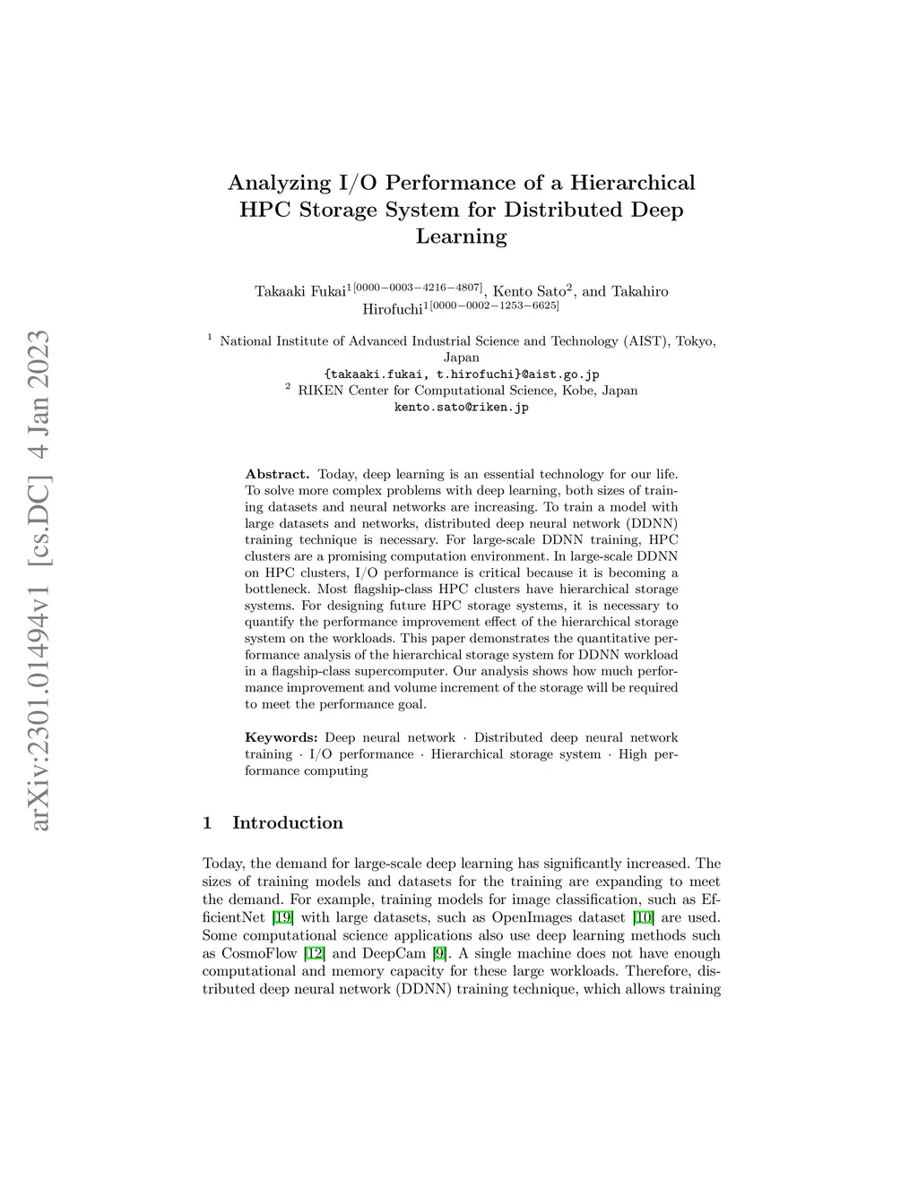 Today, deep learning is an essential technology for our life. To solve more complex problems with deep learning, both sizes of training datasets and neural networks are increasing. To train a model with large datasets and networks, distributed deep neural network (DDNN) training technique is necessary. For large-scale DDNN training, HPC clusters are a promising computation environment. In large-scale DDNN on HPC clusters, I/O performance is critical because it is becoming a bottleneck. Most flagship-class HPC clusters have hierarchical storage systems. For designing future HPC storage systems, it is necessary to quantify the performance improvement effect of the hierarchical storage system on the workloads. This paper demonstrates the quantitative performance analysis of the hierarchical storage system for DDNN workload in a flagship-class supercomputer. Our analysis shows how much performance improvement and volume increment of the storage will be required to meet the performance goal.