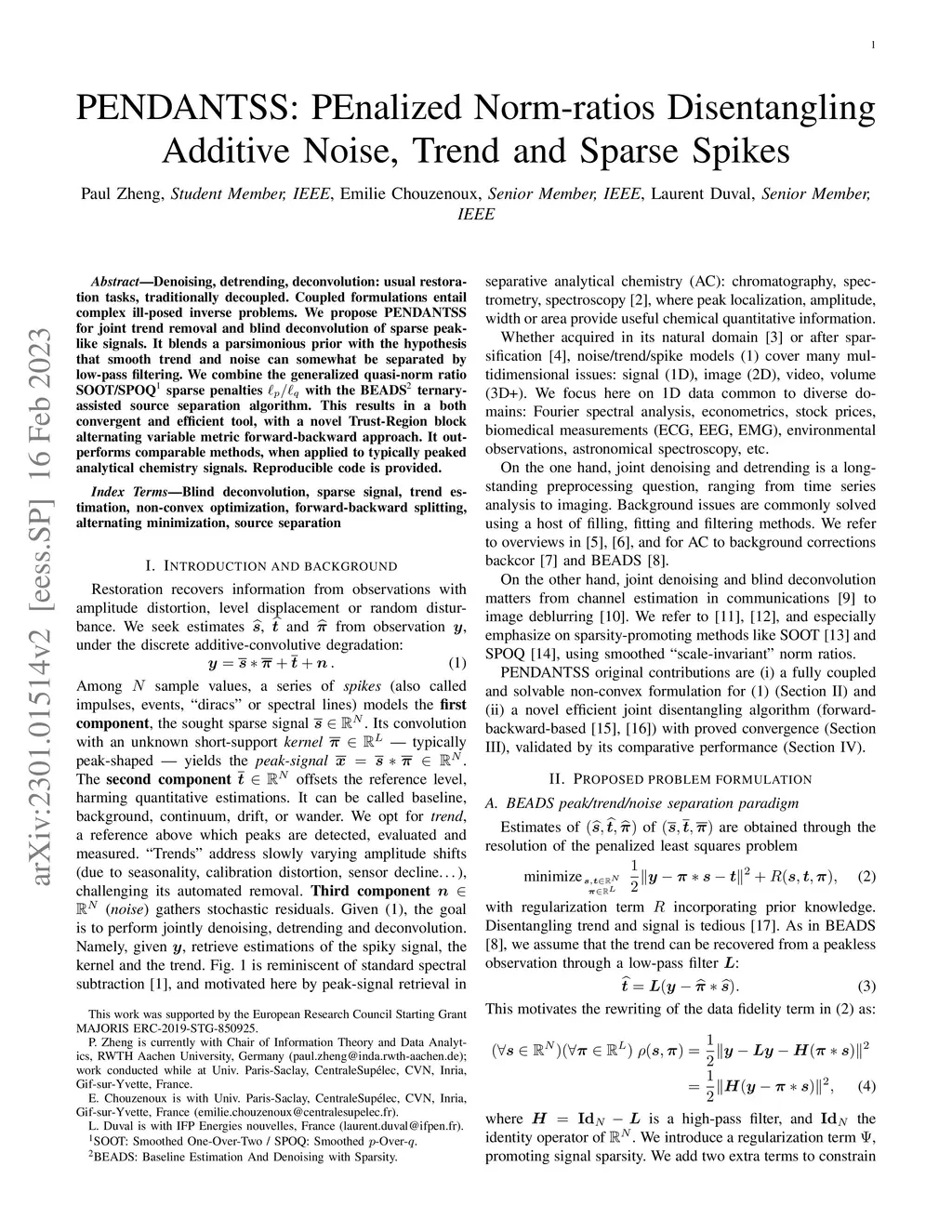 Denoising, detrending, deconvolution: usual restoration tasks, traditionally decoupled. Coupled formulations entail complex ill-posed inverse problems. We propose PENDANTSS for joint trend removal and blind deconvolution of sparse peak-like signals. It blends a parsimonious prior with the hypothesis that smooth trend and noise can somewhat be separated by low-pass filtering. We combine the generalized quasi-norm ratio SOOT/SPOQ sparse penalties with the BEADS ternary assisted source separation algorithm. This results in a both convergent and efficient tool, with a novel Trust-Region block alternating variable metric forward-backward approach. It outperforms comparable methods, when applied to typically peaked analytical chemistry signals. Reproducible code is provided.