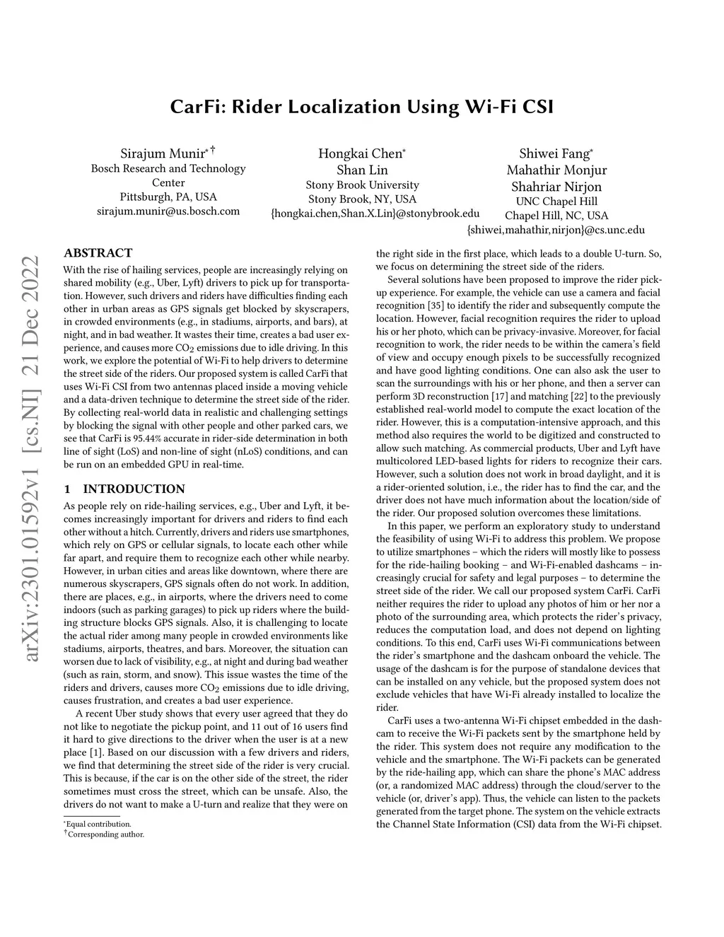 With the rise of hailing services, people are increasingly relying on shared mobility (e.g., Uber, Lyft) drivers to pick up for transportation. However, such drivers and riders have difficulties finding each other in urban areas as GPS signals get blocked by skyscrapers, in crowded environments (e.g., in stadiums, airports, and bars), at night, and in bad weather. It wastes their time, creates a bad user experience, and causes more CO2 emissions due to idle driving. In this work, we explore the potential of Wi-Fi to help drivers to determine the street side of the riders. Our proposed system is called CarFi that uses Wi-Fi CSI from two antennas placed inside a moving vehicle and a data-driven technique to determine the street side of the rider. By collecting real-world data in realistic and challenging settings by blocking the signal with other people and other parked cars, we see that CarFi is 95.44% accurate in rider-side determination in both line of sight (LoS) and non-line of sight (nLoS) conditions, and can be run on an embedded GPU in real-time.