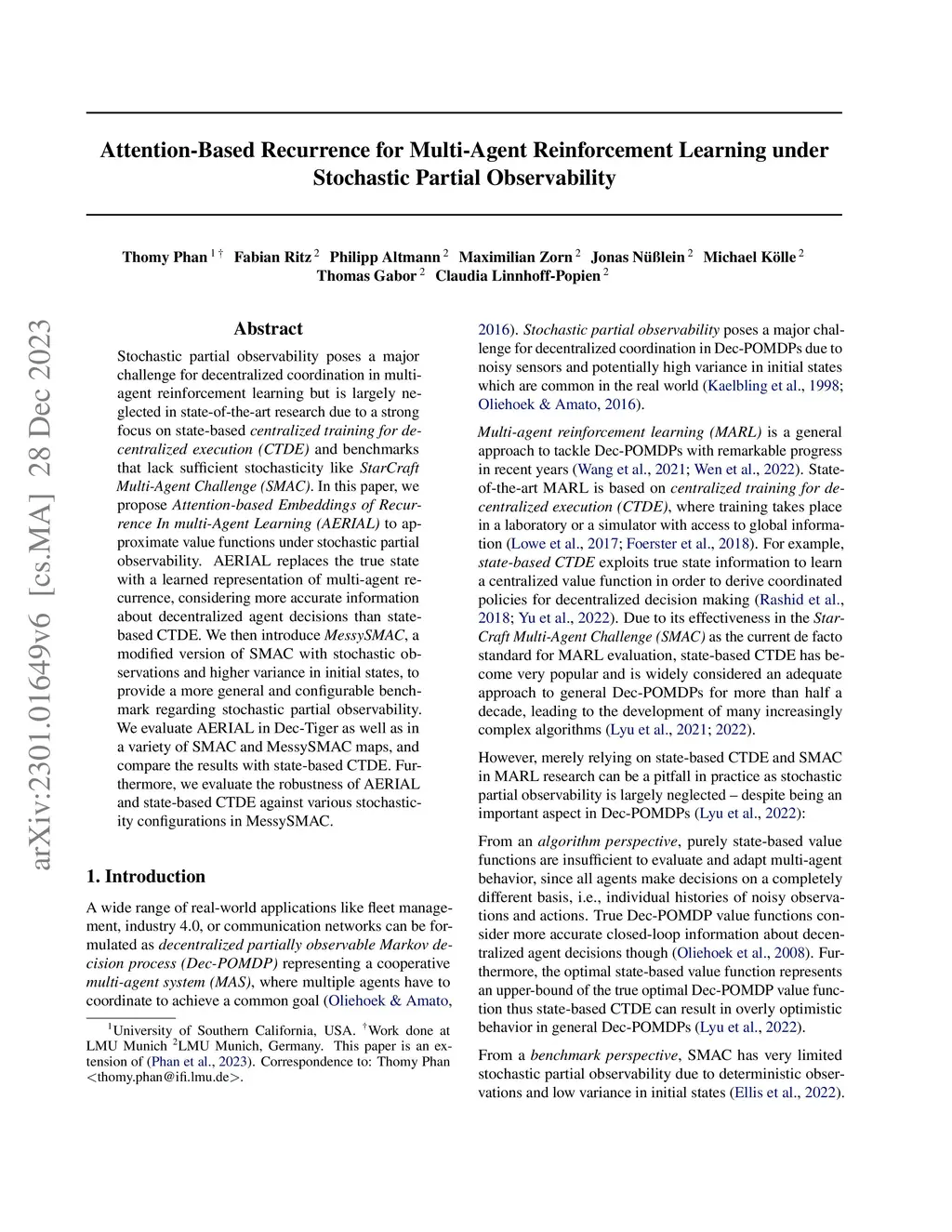Stochastic partial observability poses a major challenge for decentralized coordination in multi-agent reinforcement learning but is largely neglected in state-of-the-art research due to a strong focus on state-based centralized training for decentralized execution (CTDE) and benchmarks that lack sufficient stochasticity like StarCraft Multi-Agent Challenge (SMAC). In this paper, we propose Attention-based Embeddings of Recurrence In multi-Agent Learning (AERIAL) to approximate value functions under stochastic partial observability. AERIAL replaces the true state with a learned representation of multi-agent recurrence, considering more accurate information about decentralized agent decisions than state-based CTDE. We then introduce MessySMAC, a modified version of SMAC with stochastic observations and higher variance in initial states, to provide a more general and configurable benchmark regarding stochastic partial observability. We evaluate AERIAL in Dec-Tiger as well as in a variety of SMAC and MessySMAC maps, and compare the results with state-based CTDE. Furthermore, we evaluate the robustness of AERIAL and state-based CTDE against various stochasticity configurations in MessySMAC.
