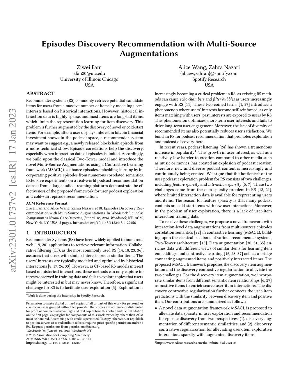 Recommender systems (RS) commonly retrieve potential candidate items for users from a massive number of items by modeling user interests based on historical interactions. However, historical interaction data is highly sparse, and most items are long-tail items, which limits the representation learning for item discovery. This problem is further augmented by the discovery of novel or cold-start items. For example, after a user displays interest in bitcoin financial investment shows in the podcast space, a recommender system may want to suggest, e.g., a newly released blockchain episode from a more technical show. Episode correlations help the discovery, especially when interaction data of episodes is limited. Accordingly, we build upon the classical Two-Tower model and introduce the novel Multi-Source Augmentations using a Contrastive Learning framework (MSACL) to enhance episode embedding learning by incorporating positive episodes from numerous correlated semantics. Extensive experiments on a real-world podcast recommendation dataset from a large audio streaming platform demonstrate the effectiveness of the proposed framework for user podcast exploration and cold-start episode recommendation.