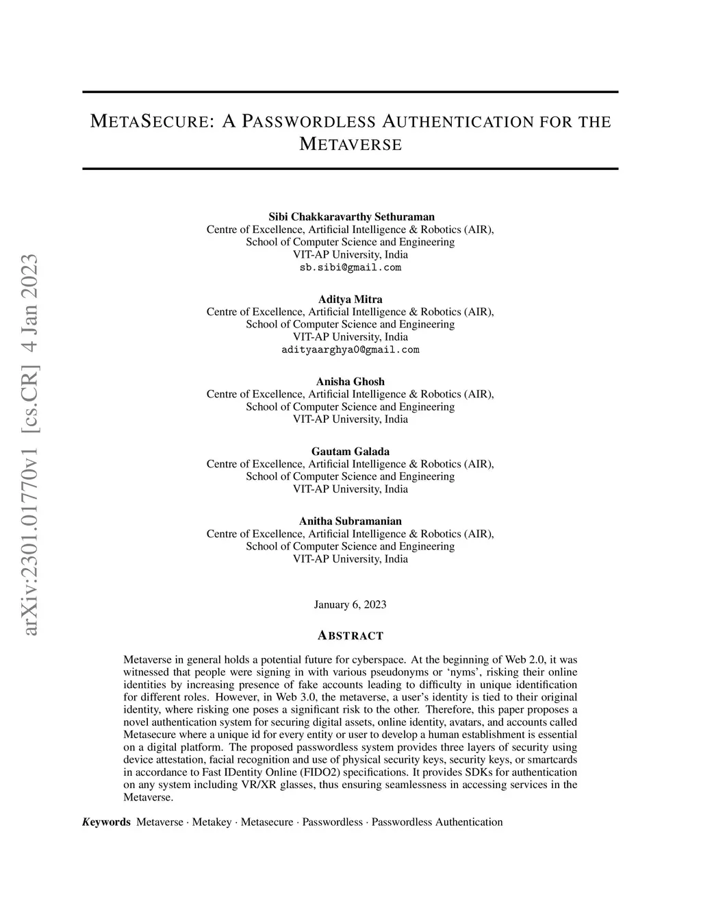 Metaverse in general holds a potential future for cyberspace. At the beginning of Web 2.0, it was witnessed that people were signing in with various pseudonyms or ñyms', risking their online identities by increasing presence of fake accounts leading to difficulty in unique identification for different roles. However, in Web 3.0, the metaverse, a user's identity is tied to their original identity, where risking one poses a significant risk to the other. Therefore, this paper proposes a novel authentication system for securing digital assets, online identity, avatars, and accounts called Metasecure where a unique id for every entity or user to develop a human establishment is essential on a digital platform. The proposed passwordless system provides three layers of security using device attestation, facial recognition and use of physical security keys, security keys, or smartcards in accordance to Fast IDentity Online (FIDO2) specifications. It provides SDKs for authentication on any system including VR/XR glasses, thus ensuring seamlessness in accessing services in the Metaverse.
