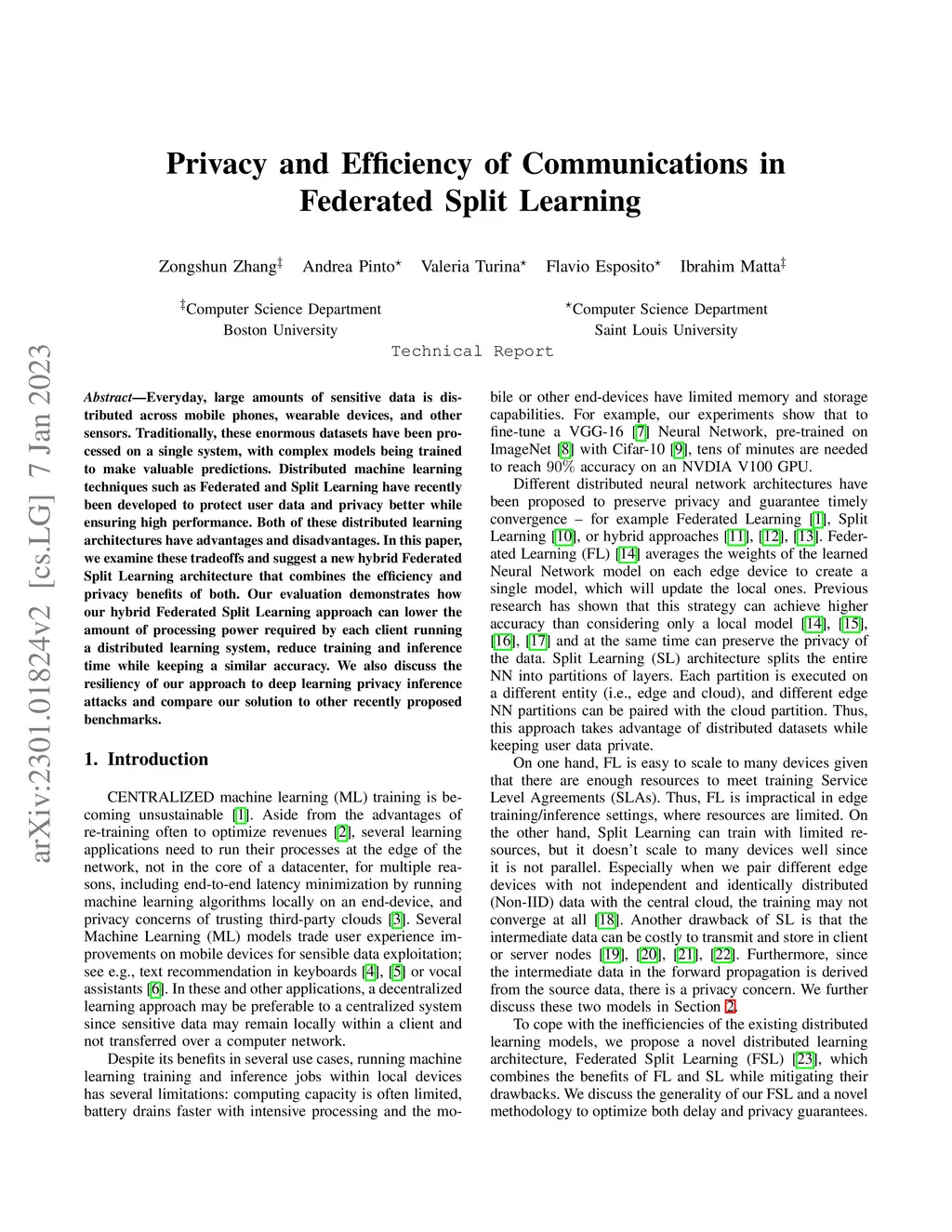 Privacy and Efficiency of Communications in Federated Split Learning