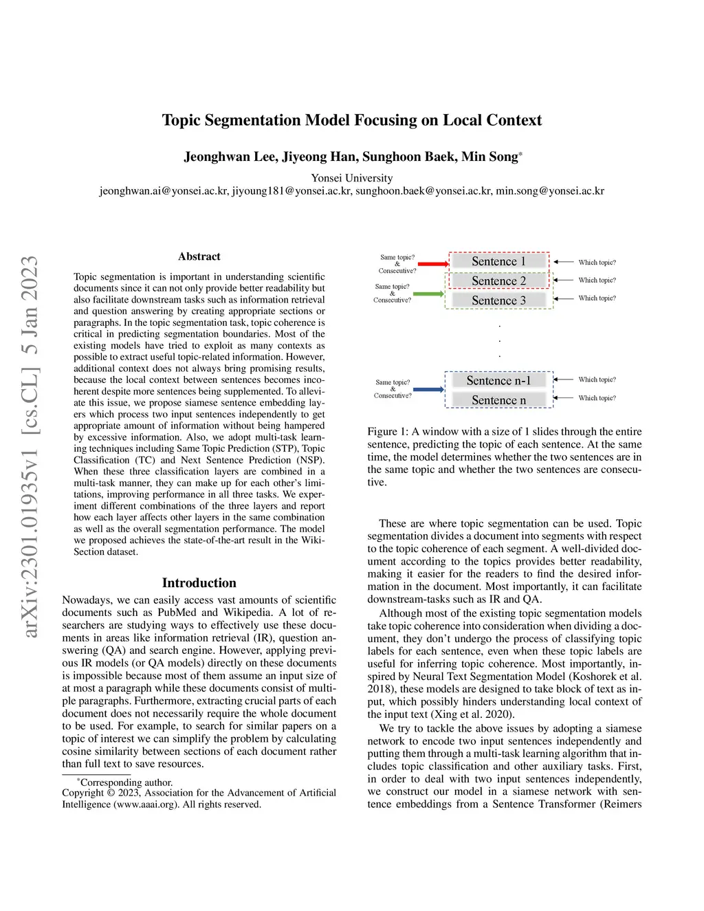 Topic segmentation is important in understanding scientific documents since it can not only provide better readability but also facilitate downstream tasks such as information retrieval and question answering by creating appropriate sections or paragraphs. In the topic segmentation task, topic coherence is critical in predicting segmentation boundaries. Most of the existing models have tried to exploit as many contexts as possible to extract useful topic-related information. However, additional context does not always bring promising results, because the local context between sentences becomes incoherent despite more sentences being supplemented. To alleviate this issue, we propose siamese sentence embedding layers which process two input sentences independently to get appropriate amount of information without being hampered by excessive information. Also, we adopt multi-task learning techniques including Same Topic Prediction (STP), Topic Classification (TC) and Next Sentence Prediction (NSP). When these three classification layers are combined in a multi-task manner, they can make up for each other's limitations, improving performance in all three tasks. We experiment different combinations of the three layers and report how each layer affects other layers in the same combination as well as the overall segmentation performance. The model we proposed achieves the state-of-the-art result in the WikiSection dataset.