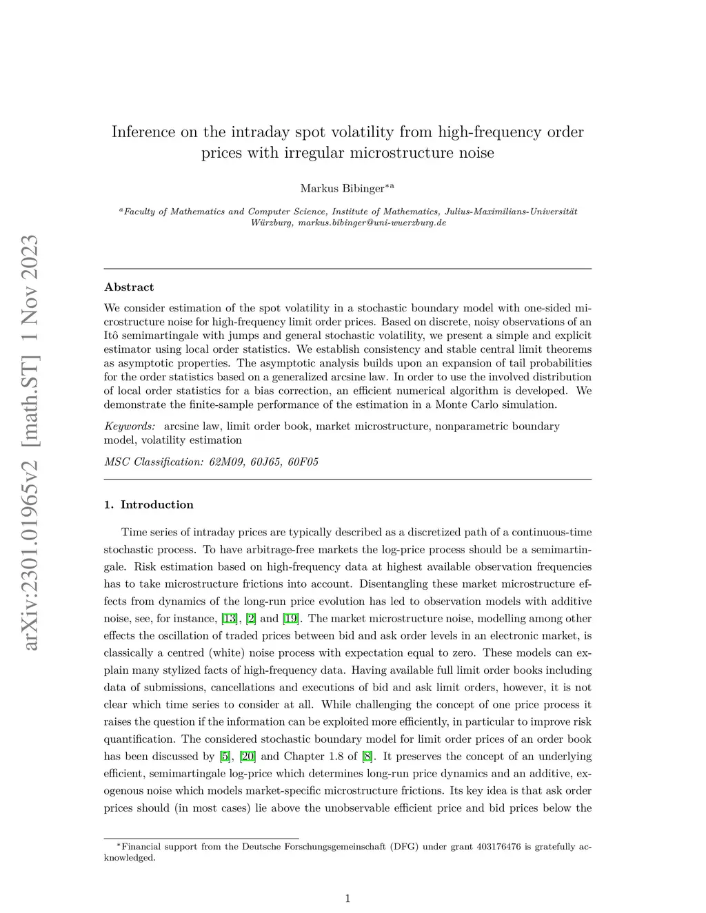 We consider estimation of the spot volatility in a stochastic boundary model with one-sided microstructure noise for high-frequency limit order prices. Based on discrete, noisy observations of an It\^o semimartingale with jumps and general stochastic volatility, we present a simple and explicit estimator using local order statistics. We establish consistency and stable central limit theorems as asymptotic properties. The asymptotic analysis builds upon an expansion of tail probabilities for the order statistics based on a generalized arcsine law. In order to use the involved distribution of local order statistics for a bias correction, an efficient numerical algorithm is developed. We demonstrate the finite-sample performance of the estimation in a Monte Carlo simulation.