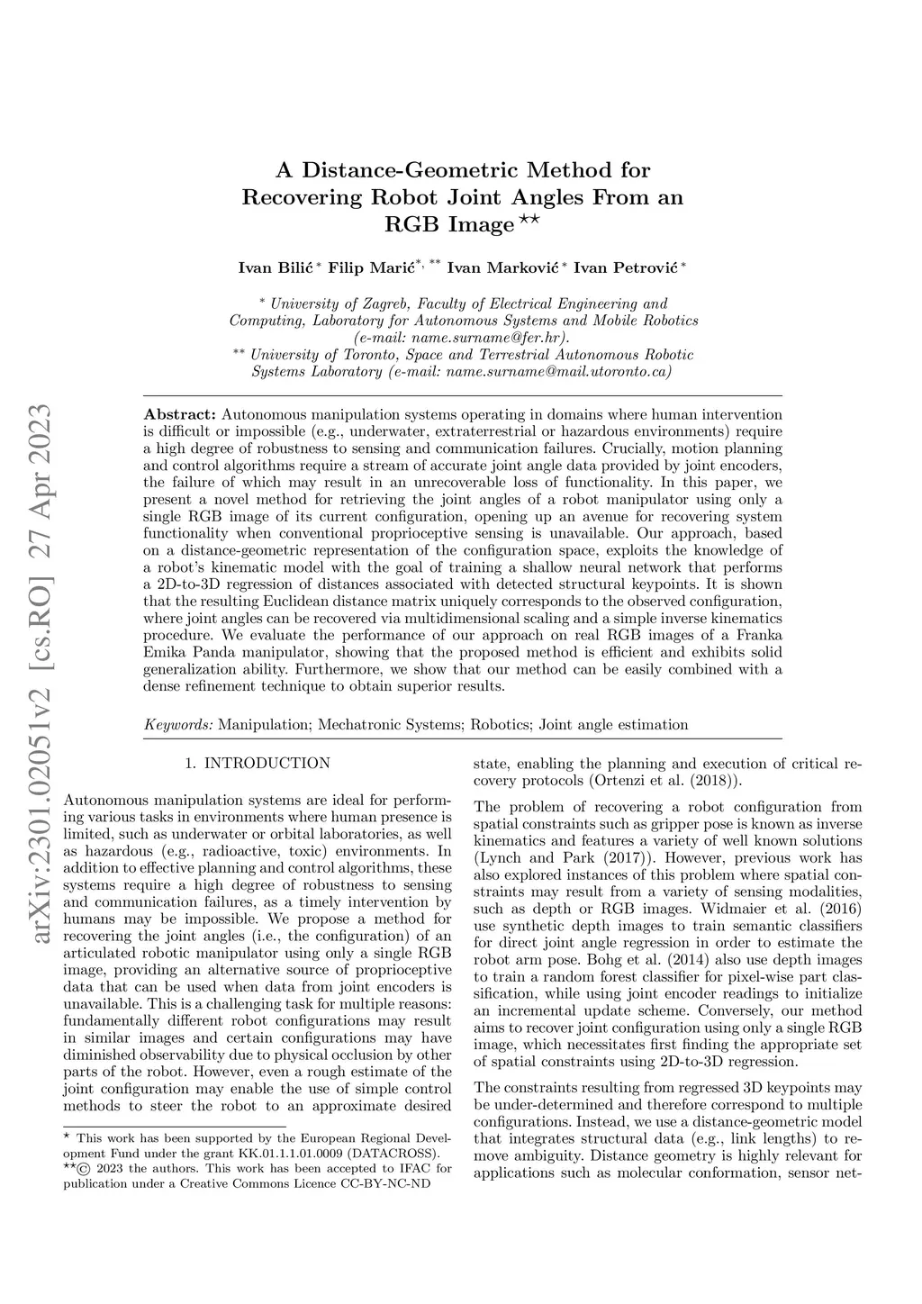 Autonomous manipulation systems operating in domains where human intervention is difficult or impossible (e.g., underwater, extraterrestrial or hazardous environments) require a high degree of robustness to sensing and communication failures. Crucially, motion planning and control algorithms require a stream of accurate joint angle data provided by joint encoders, the failure of which may result in an unrecoverable loss of functionality. In this paper, we present a novel method for retrieving the joint angles of a robot manipulator using only a single RGB image of its current configuration, opening up an avenue for recovering system functionality when conventional proprioceptive sensing is unavailable. Our approach, based on a distance-geometric representation of the configuration space, exploits the knowledge of a robot's kinematic model with the goal of training a shallow neural network that performs a 2D-to-3D regression of distances associated with detected structural keypoints. It is shown that the resulting Euclidean distance matrix uniquely corresponds to the observed configuration, where joint angles can be recovered via multidimensional scaling and a simple inverse kinematics procedure. We evaluate the performance of our approach on real RGB images of a Franka Emika Panda manipulator, showing that the proposed method is efficient and exhibits solid generalization ability. Furthermore, we show that our method can be easily combined with a dense refinement technique to obtain superior results.