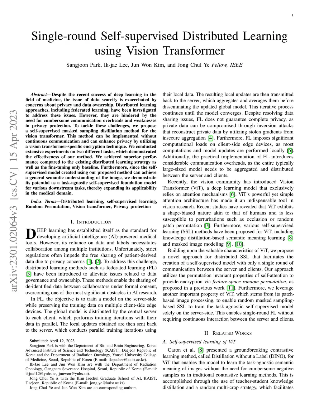 Despite the recent success of deep learning in the field of medicine, the issue of data scarcity is exacerbated by concerns about privacy and data ownership. Distributed learning approaches, including federated learning, have been investigated to address these issues. However, they are hindered by the need for cumbersome communication overheads and weaknesses in privacy protection. To tackle these challenges, we propose a self-supervised masked sampling distillation method for the vision transformer. This method can be implemented without continuous communication and can enhance privacy by utilizing a vision transformer-specific encryption technique. We conducted extensive experiments on two different tasks, which demonstrated the effectiveness of our method. We achieved superior performance compared to the existing distributed learning strategy as well as the fine-tuning only baseline. Furthermore, since the self-supervised model created using our proposed method can achieve a general semantic understanding of the image, we demonstrate its potential as a task-agnostic self-supervised foundation model for various downstream tasks, thereby expanding its applicability in the medical domain.
