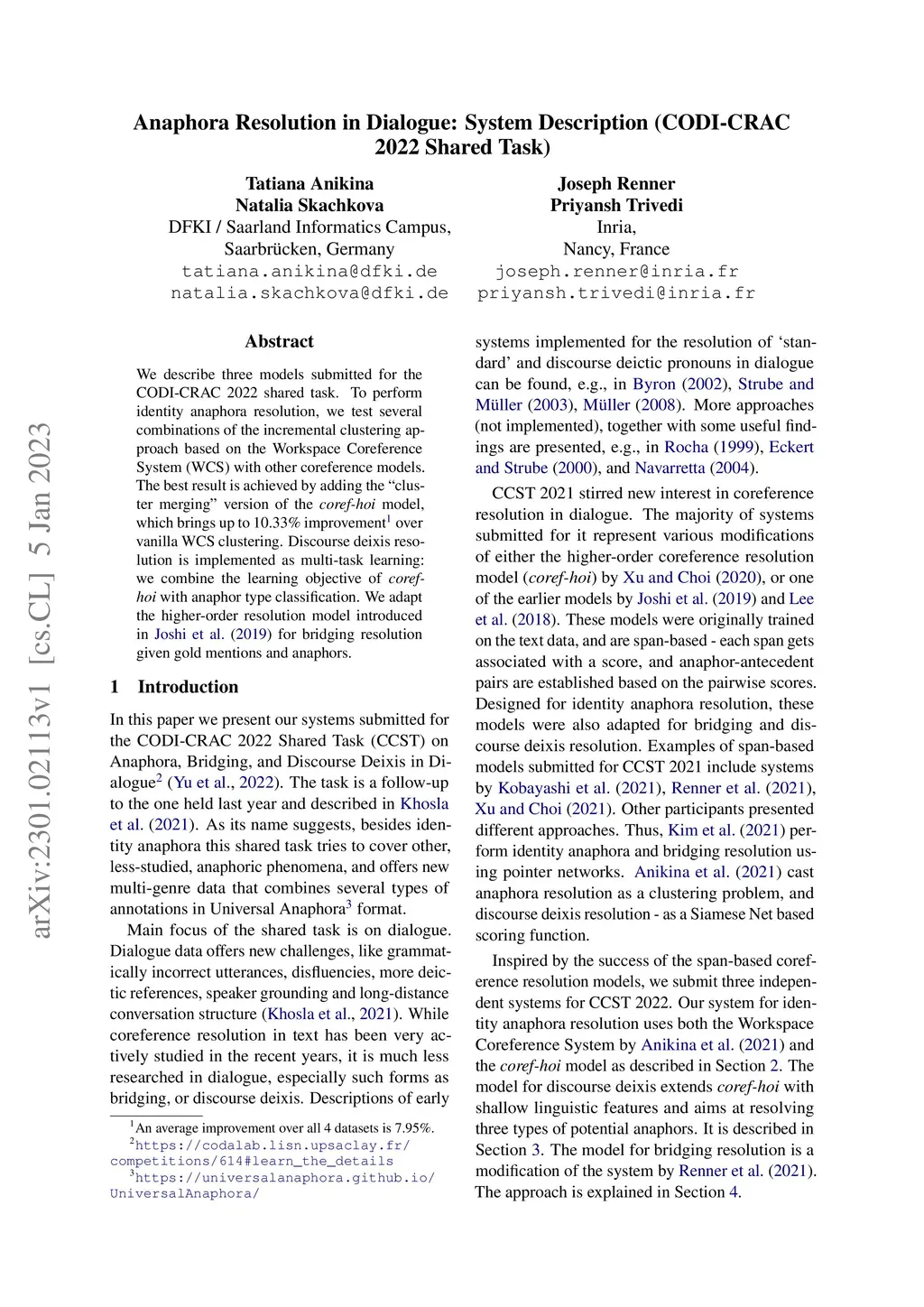 We describe three models submitted for the CODI-CRAC 2022 shared task. To perform identity anaphora resolution, we test several combinations of the incremental clustering approach based on the Workspace Coreference System (WCS) with other coreference models. The best result is achieved by adding the ''cluster merging'' version of the coref-hoi model, which brings up to 10.33% improvement 1 over vanilla WCS clustering. Discourse deixis resolution is implemented as multi-task learning: we combine the learning objective of corefhoi with anaphor type classification. We adapt the higher-order resolution model introduced in Joshi et al. (2019) for bridging resolution given gold mentions and anaphors.