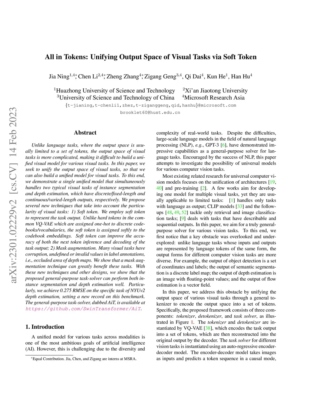 Unlike language tasks, where the output space is usually limited to a set of tokens, the output space of visual tasks is more complicated, making it difficult to build a unified visual model for various visual tasks. In this paper, we seek to unify the output space of visual tasks, so that we can also build a unified model for visual tasks. To this end, we demonstrate a single unified model that simultaneously handles two typical visual tasks of instance segmentation and depth estimation, which have discrete/fixed-length and continuous/varied-length outputs, respectively. We propose several new techniques that take into account the particularity of visual tasks: 1) Soft token. We employ soft token to represent the task output. Unlike hard tokens in the common VQ-VAE which are assigned one-hot to discrete codebooks/vocabularies, the soft token is assigned softly to the codebook embeddings. Soft token can improve the accuracy of both the next token inference and decoding of the task output; 2) Mask augmentation. Many visual tasks have corruption, undefined or invalid values in label annotations, i.e., occluded area of depth maps. We show that a mask augmentation technique can greatly benefit these tasks. With these new techniques and other designs, we show that the proposed general-purpose task-solver can perform both instance segmentation and depth estimation well. Particularly, we achieve 0.279 RMSE on the specific task of NYUv2 depth estimation, setting a new record on this benchmark. The general-purpose task-solver, dubbed AiT, is available at \url{https://github.com/SwinTransformer/AiT}.