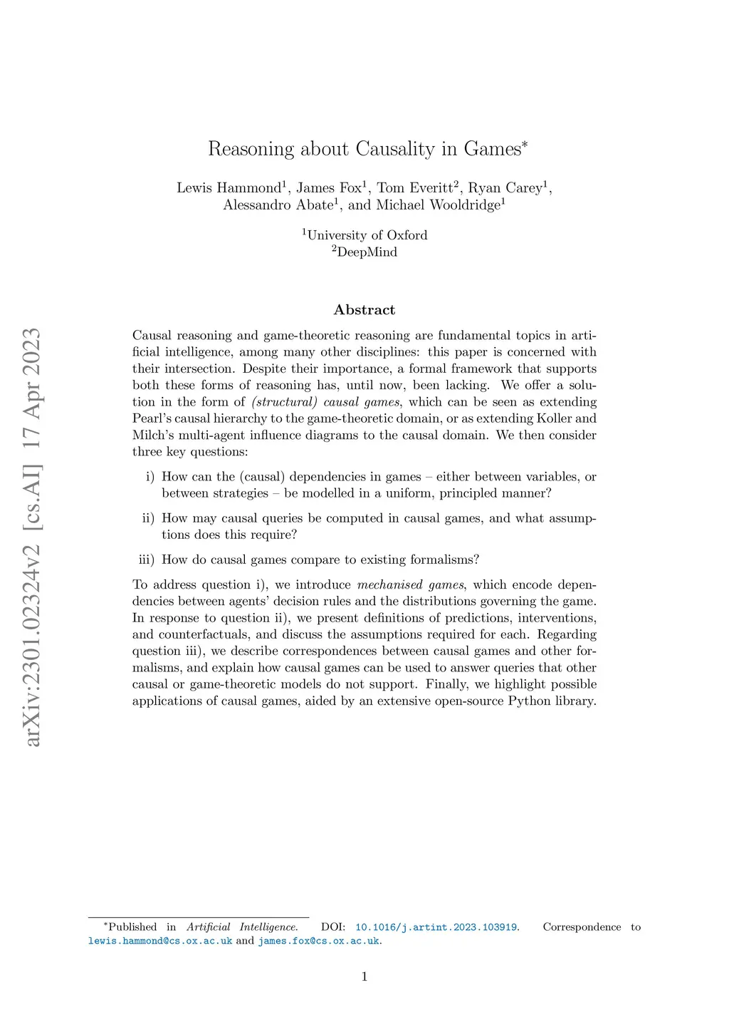 Causal reasoning and game-theoretic reasoning are fundamental topics in artificial intelligence, among many other disciplines: this paper is concerned with their intersection. Despite their importance, a formal framework that supports both these forms of reasoning has, until now, been lacking. We offer a solution in the form of (structural) causal games, which can be seen as extending Pearl's causal hierarchy to the game-theoretic domain, or as extending Koller and Milch's multi-agent influence diagrams to the causal domain. We then consider three key questions: i) How can the (causal) dependencies in games - either between variables, or between strategies - be modelled in a uniform, principled manner? ii) How may causal queries be computed in causal games, and what assumptions does this require? iii) How do causal games compare to existing formalisms? To address question i), we introduce mechanised games, which encode dependencies between agents' decision rules and the distributions governing the game. In response to question ii), we present definitions of predictions, interventions, and counterfactuals, and discuss the assumptions required for each. Regarding question iii), we describe correspondences between causal games and other formalisms, and explain how causal games can be used to answer queries that other causal or game-theoretic models do not support. Finally, we highlight possible applications of causal games, aided by an extensive open-source Python library.