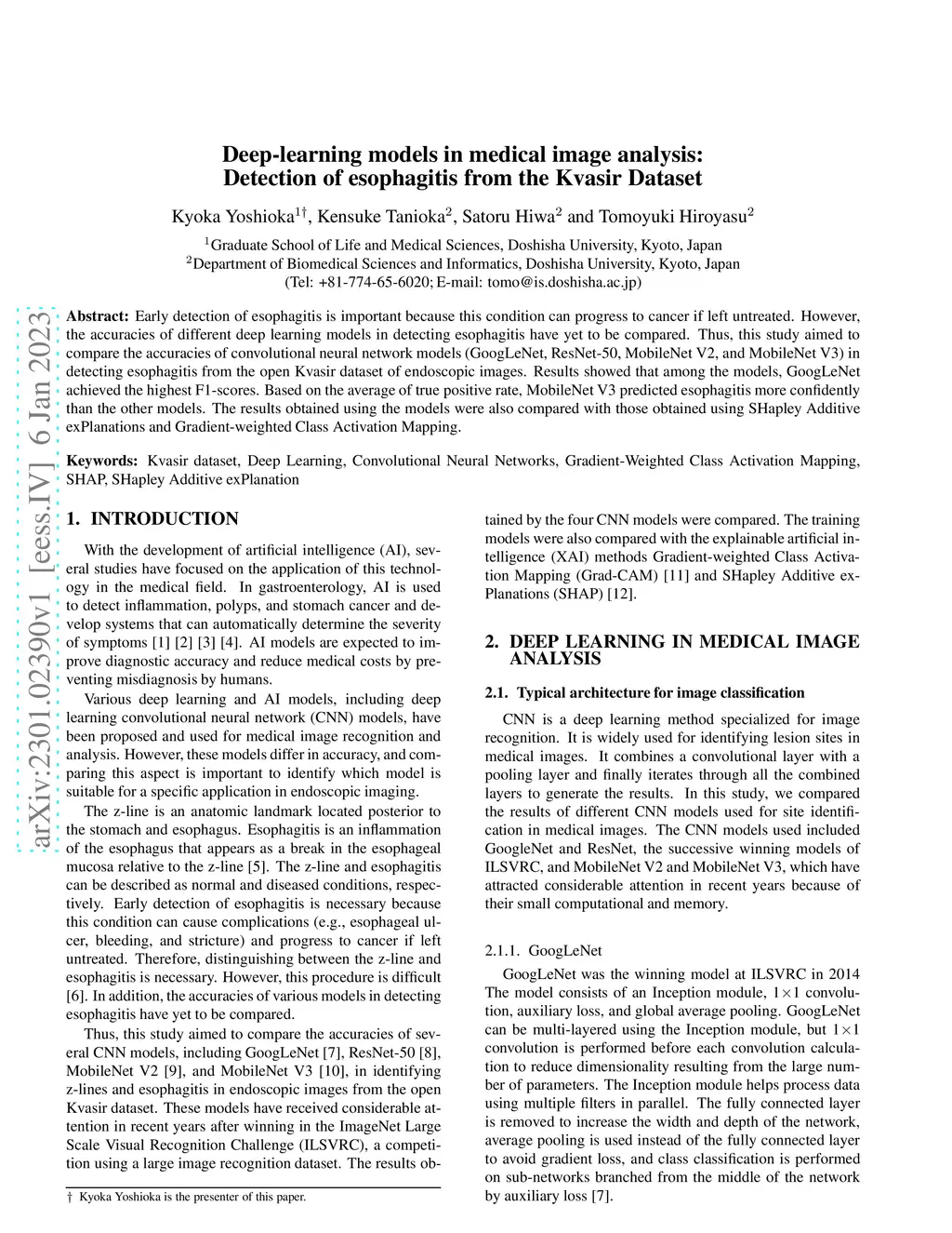 Early detection of esophagitis is important because this condition can progress to cancer if left untreated. However, the accuracies of different deep learning models in detecting esophagitis have yet to be compared. Thus, this study aimed to compare the accuracies of convolutional neural network models (GoogLeNet, ResNet-50, MobileNet V2, and MobileNet V3) in detecting esophagitis from the open Kvasir dataset of endoscopic images. Results showed that among the models, GoogLeNet achieved the highest F1-scores. Based on the average of true positive rate, MobileNet V3 predicted esophagitis more confidently than the other models. The results obtained using the models were also compared with those obtained using SHapley Additive exPlanations and Gradient-weighted Class Activation Mapping.
