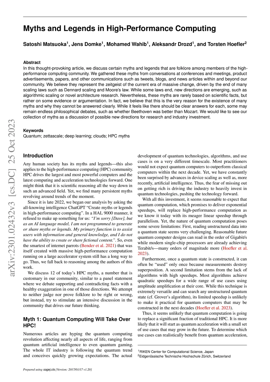 In this thought-provoking article, we discuss certain myths and legends that are folklore among members of the high-performance computing community. We gathered these myths from conversations at conferences and meetings, product advertisements, papers, and other communications such as tweets, blogs, and news articles within and beyond our community. We believe they represent the zeitgeist of the current era of massive change, driven by the end of many scaling laws such as Dennard scaling and Moore's law. While some laws end, new directions are emerging, such as algorithmic scaling or novel architecture research. Nevertheless, these myths are rarely based on scientific facts, but rather on some evidence or argumentation. In fact, we believe that this is the very reason for the existence of many myths and why they cannot be answered clearly. While it feels like there should be clear answers for each, some may remain endless philosophical debates, such as whether Beethoven was better than Mozart. We would like to see our collection of myths as a discussion of possible new directions for research and industry investment.