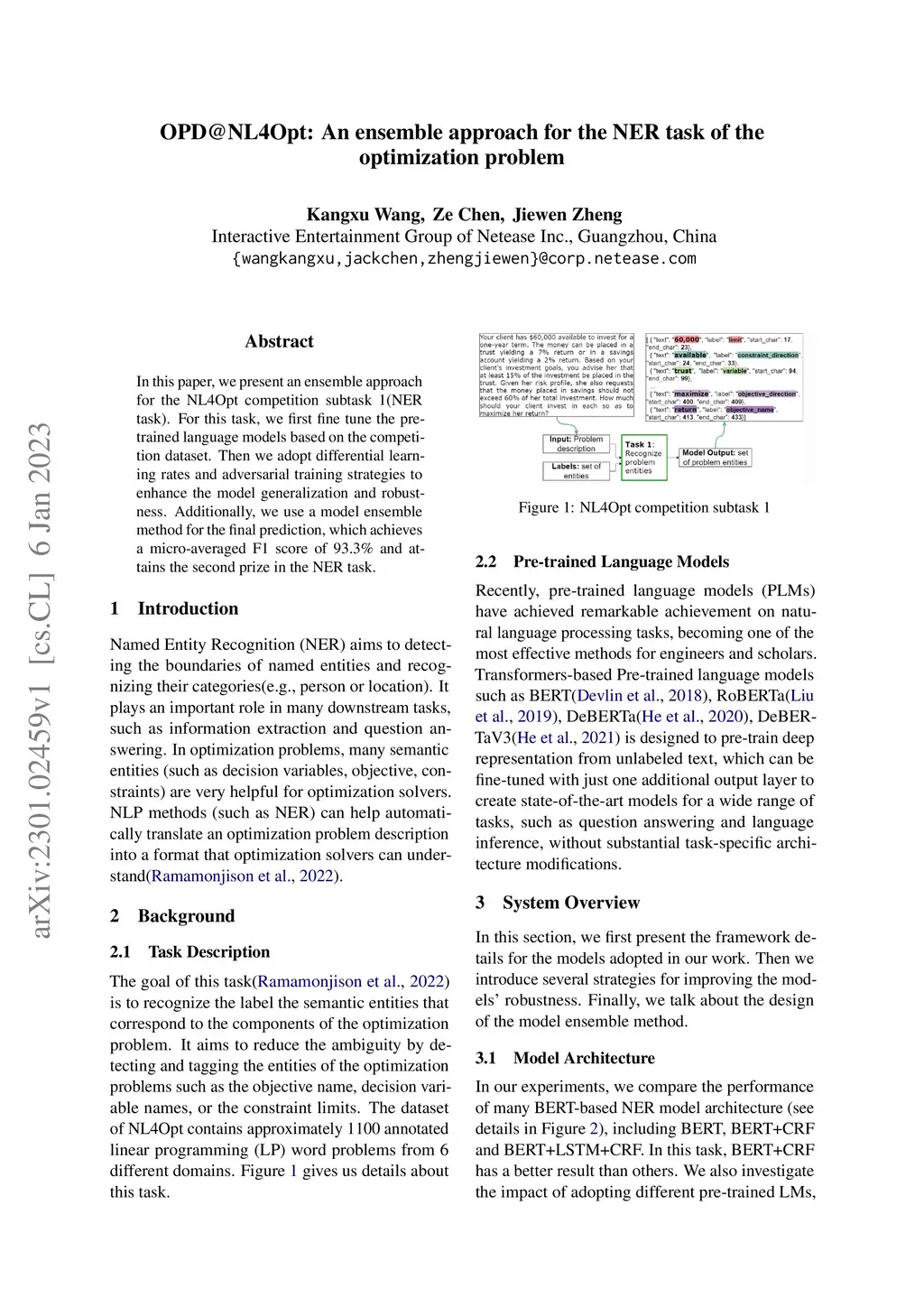 In this paper, we present an ensemble approach for the NL4Opt competition subtask 1(NER task). For this task, we first fine tune the pretrained language models based on the competition dataset. Then we adopt differential learning rates and adversarial training strategies to enhance the model generalization and robustness. Additionally, we use a model ensemble method for the final prediction, which achieves a micro-averaged F1 score of 93.3% and attains the second prize in the NER task.
