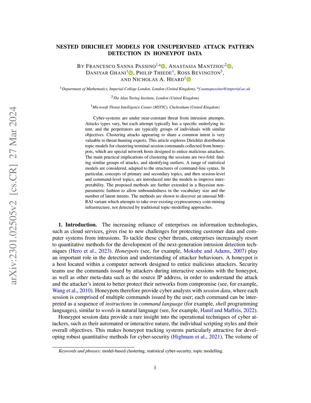 Cyber-systems are under near-constant threat from intrusion attempts. Attacks types vary, but each attempt typically has a specific underlying intent, and the perpetrators are typically groups of individuals with similar objectives. Clustering attacks appearing to share a common intent is very valuable to threat-hunting experts. This article explores topic models for clustering terminal session commands collected from honeypots, which are special network hosts designed to entice malicious attackers. The main practical implications of clustering the sessions are two-fold: finding similar groups of attacks, and identifying outliers. A range of statistical topic models are considered, adapted to the structures of command-line syntax. In particular, concepts of primary and secondary topics, and then session-level and command-level topics, are introduced into the models to improve interpretability. The proposed methods are further extended in a Bayesian nonparametric fashion to allow unboundedness in the vocabulary size and the number of latent intents. The methods are shown to discover an unusual MIRAI variant which attempts to take over existing cryptocurrency coin-mining infrastructure, not detected by traditional topic-modelling approaches.