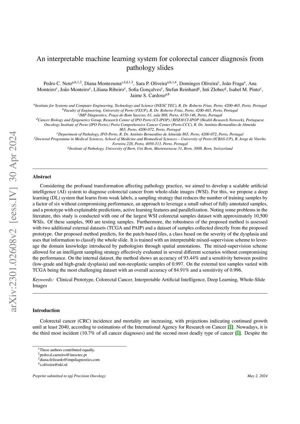 Considering the profound transformation affecting pathology practice, we aimed to develop a scalable artificial intelligence (AI) system to diagnose colorectal cancer from whole-slide images (WSI). For this, we propose a deep learning (DL) system that learns from weak labels, a sampling strategy that reduces the number of training samples by a factor of six without compromising performance, an approach to leverage a small subset of fully annotated samples, and a prototype with explainable predictions, active learning features and parallelisation. Noting some problems in the literature, this study is conducted with one of the largest WSI colorectal samples dataset with approximately 10,500 WSIs. Of these samples, 900 are testing samples. Furthermore, the robustness of the proposed method is assessed with two additional external datasets (TCGA and PAIP) and a dataset of samples collected directly from the proposed prototype. Our proposed method predicts, for the patch-based tiles, a class based on the severity of the dysplasia and uses that information to classify the whole slide. It is trained with an interpretable mixed-supervision scheme to leverage the domain knowledge introduced by pathologists through spatial annotations. The mixed-supervision scheme allowed for an intelligent sampling strategy effectively evaluated in several different scenarios without compromising the performance. On the internal dataset, the method shows an accuracy of 93.44% and a sensitivity between positive (low-grade and high-grade dysplasia) and non-neoplastic samples of 0.996. On the external test samples varied with TCGA being the most challenging dataset with an overall accuracy of 84.91% and a sensitivity of 0.996.