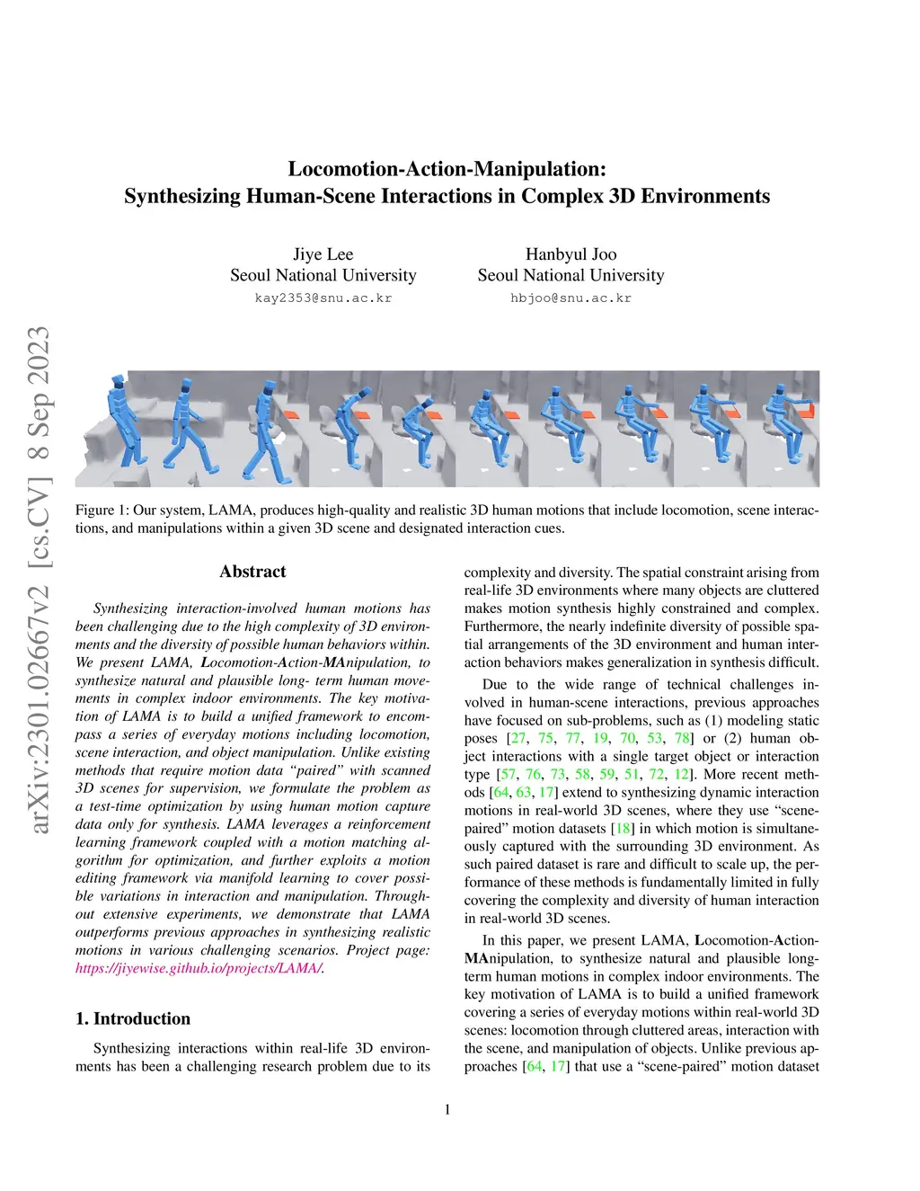 Synthesizing interaction-involved human motions has been challenging due to the high complexity of 3D environments and the diversity of possible human behaviors within. We present LAMA, Locomotion-Action-MAnipulation, to synthesize natural and plausible long-term human movements in complex indoor environments. The key motivation of LAMA is to build a unified framework to encompass a series of everyday motions including locomotion, scene interaction, and object manipulation. Unlike existing methods that require motion data "paired" with scanned 3D scenes for supervision, we formulate the problem as a test-time optimization by using human motion capture data only for synthesis. LAMA leverages a reinforcement learning framework coupled with a motion matching algorithm for optimization, and further exploits a motion editing framework via manifold learning to cover possible variations in interaction and manipulation. Throughout extensive experiments, we demonstrate that LAMA outperforms previous approaches in synthesizing realistic motions in various challenging scenarios. Project page: https://jiyewise.github.io/projects/LAMA/ .