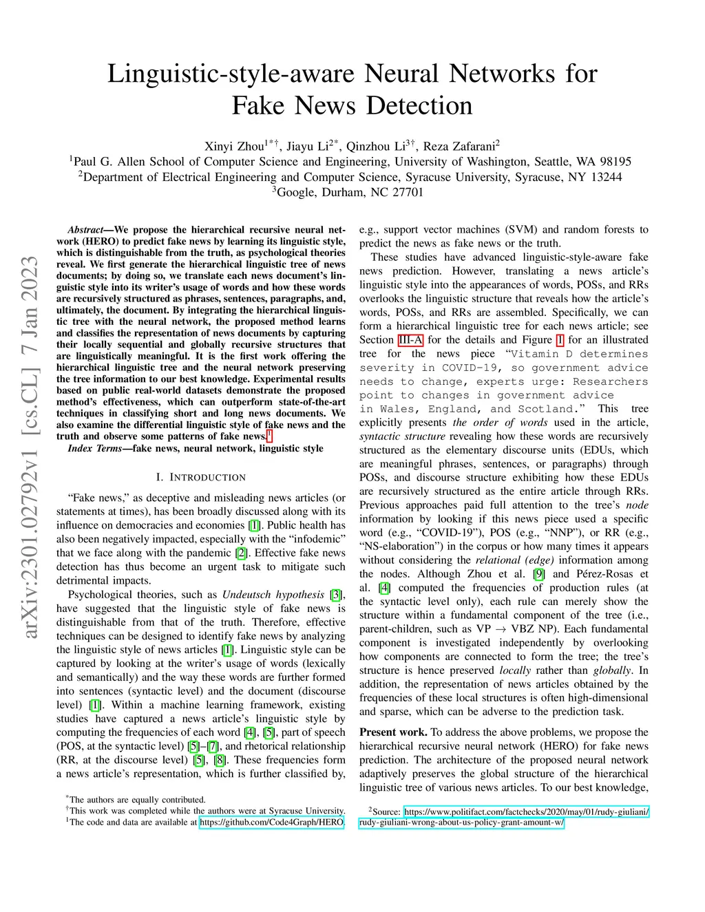 We propose the hierarchical recursive neural network (HERO) to predict fake news by learning its linguistic style, which is distinguishable from the truth, as psychological theories reveal. We first generate the hierarchical linguistic tree of news documents; by doing so, we translate each news document's linguistic style into its writer's usage of words and how these words are recursively structured as phrases, sentences, paragraphs, and, ultimately, the document. By integrating the hierarchical linguistic tree with the neural network, the proposed method learns and classifies the representation of news documents by capturing their locally sequential and globally recursive structures that are linguistically meaningful. It is the first work offering the hierarchical linguistic tree and the neural network preserving the tree information to our best knowledge. Experimental results based on public real-world datasets demonstrate the proposed method's effectiveness, which can outperform state-of-the-art techniques in classifying short and long news documents. We also examine the differential linguistic style of fake news and the truth and observe some patterns of fake news. The code and data have been publicly available.