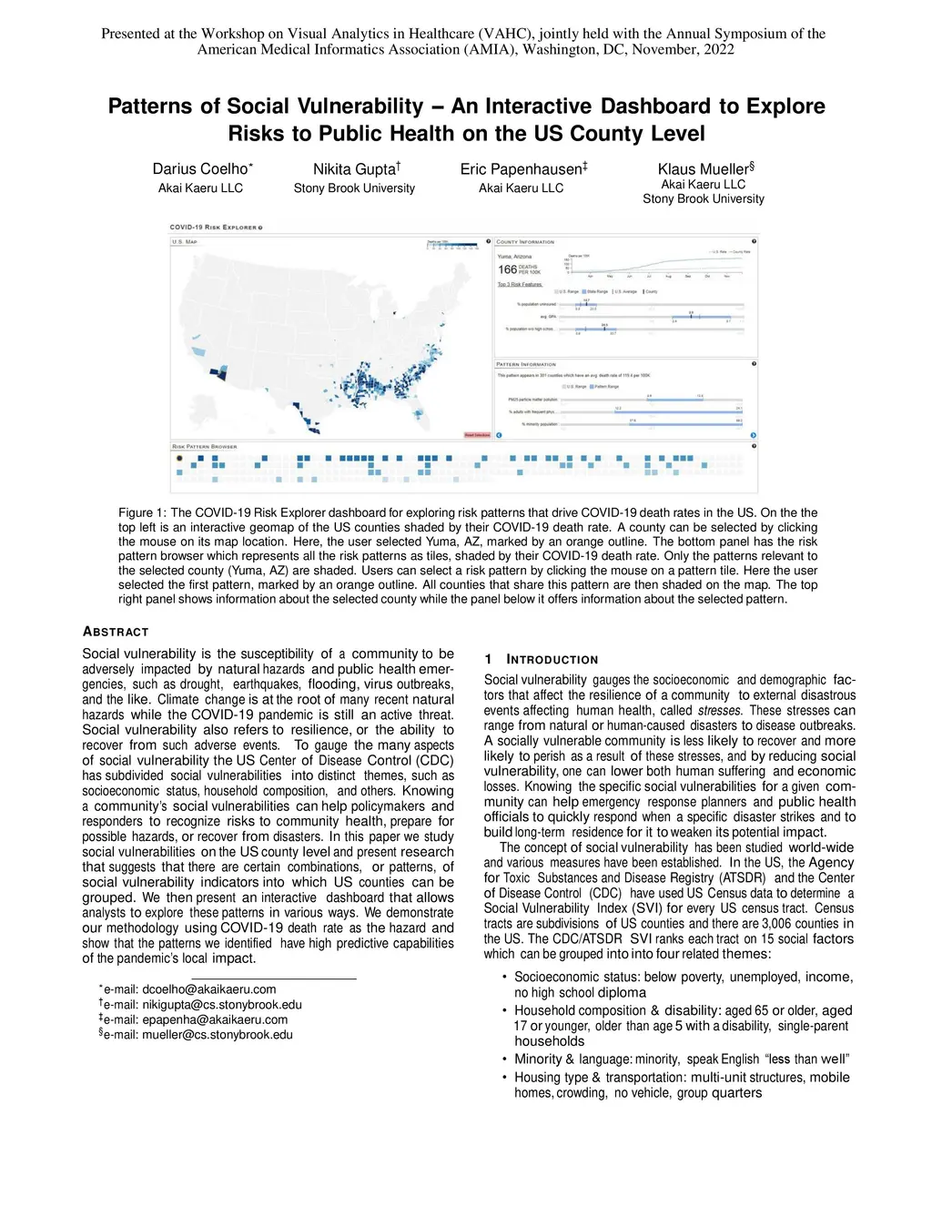 Social vulnerability is the susceptibility of a community to be adversely impacted by natural hazards and public health emergencies, such as drought, earthquakes, flooding, virus outbreaks, and the like. Climate change is at the root of many recent natural hazards while the COVID-19 pandemic is still an active threat. Social vulnerability also refers to resilience, or the ability to recover from such adverse events. To gauge the many aspects of social vulnerability the US Center of Disease Control (CDC) has subdivided social vulnerabilities into distinct themes, such as socioeconomic status, household composition, and others. Knowing a community's social vulnerabilities can help policymakers and responders to recognize risks to community health, prepare for possible hazards, or recover from disasters. In this paper we study social vulnerabilities on the US county level and present research that suggests that there are certain combinations, or patterns, of social vulnerability indicators into which US counties can be grouped. We then present an interactive dashboard that allows analysts to explore these patterns in various ways. We demonstrate our methodology using COVID-19 death rate as the hazard and show that the patterns we identified have high predictive capabilities of the pandemic's local impact.